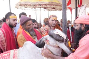 प्रयागराज। गौ माता की रक्षा एवं गौ माता को राष्ट्र माता के आसान पर विराजमान कराने के संकल्प के साथ परमाराध्य परमधर्माधीश ज्योतिष्पीठाधीश्वर जगदगुरु शङ्कराचार्य स्वामिश्री: अविमुक्तेश्वरानन्द: सरस्वती ‘1008’जी महाराज का रामा गौ मंगल प्रवेश शुक्रवार को माघ मेला शिविर में हुआ। इस अवसर पर भव्य पेशवाई निकाली गई। इसमें बड़ी संख्या में संत महात्मा और अनुयायी सम्मिलित हुए।