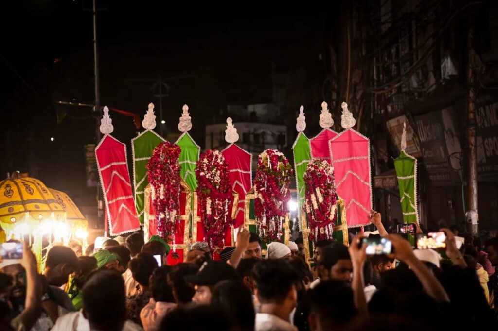 प्रयागराज माहे मोहर्रम की 2 तारीख को बड़े ताजिया का अलम उठाया गया ईशा की नमाज के बाद फतिया हुई नगाड़ा बजाया गया या अली या हुसैन के साथ अलम उठ जाता है बड़े ताजिया से अलम उठकर जॉनसेन गंज चौराहा पहुंचता है बनारस से आए हुए शहनाई वादक ने मतिमी धुन बजाया सभी की आंखें नम हो गई वाराणसी से आए हुए ढोल ताशा पार्टी ने अपने करतब दिखाये एवंन उस बैंड पर नोहा पढ़ा गया जिसका रिहर्सल महीनो से हो रहा था जो माहौल को और भी गमगीन बना रहा था।अलम पर औरतें फूल माला चढ़कर मन्नते मांग रही थी बच्चों को बोशा कराया जा रहा था शहर उत्तरी के लोकप्रिय विधायक हर्षवर्धन बाजपेई भी अलम में शामिल हुए उन्होंने कहा हुसैन सबके हैं उनकी शहादत को सभी को अपने जीवन में उतरना चाहिए बच्चे ई रिक्शा से सवार होकर या अली या हुसैन का नारा बुलंद कर रहे थे हुसैन के चाहने वालों के हाथ में इस्लामी झंडे के साथ तिरंगा झंडा भी था जो देश की शान बढ़ा रहा थाअलम जॉनसेन गंज लीडर रोड खारी कुआं शाहगंज शाह नूर अलीगंज पत्थर गली नखासा कोना सेवई मंडी कोतवाली ठठेरी बाजार पुराना पान दरीबा होते हुए बड़े ताजिया पहुंचकर अलम के फूल को ठंडा किया गया बड़े ताजिया के अलम में फरहत खान चांद मियां जावेद खान वजीर खान सलामतुल्लाह पार्षद वसीम खान अकरम शगुन अफजल खान मोहम्मद आमिर जिया उबेद खान पार्षद खान महबूब डाबर गुड्डू भाई आरशी शदाब सोहेल शब्बर डॉक्टर जाहिद आसिफ सानू आलम जिब्रारान आदि हजारों लोग अलम में शामिल हुए शाहगंज थाना कोतवाली पुलिस ट्रैफिक व्यवस्था को दुरुस्त किए हुए थी सकुशल बड़े ताजिया का अलम को संपन्न कराया।