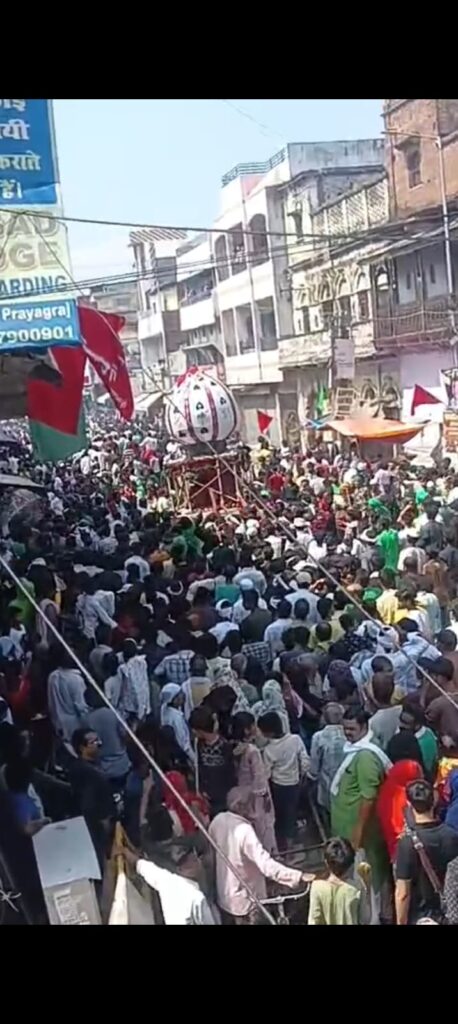 प्रयागराज माहे मोहर्रम की दस तारीख को बड़ा ताजिया उठाया गया बाद नमाज जोहर तजिया उठाया गया ताजिया बड़े ताजिया में गश्त करने के बाद जॉनसेन गंज चौराहा पहुंचता है यहां पर हुसैन के शैदाइयों की भारी भीड़ होती है इस भीड को कंट्रोल करने के लिए बहुत मेहनत करना पड़ता है हर कोई बोसा लेने फूल चढ़ाने मन्नत मांगने मन्नत की चीजे चढ़ाने के लिए बेचैन नजर आया।