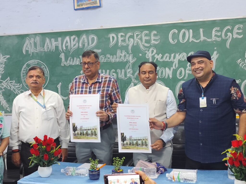 तदुपरांत विधि विभाग,इलाहाबाद डिग्री कॉलेज के न्यूज़ लेटर ‘वोक्स लेगिस’ (VOX LEGIS)के आवरण चित्र का अनावरण उपस्थित अतिथियों, शिक्षकों एवं संपादक मंडल के हाथों हुआ।
