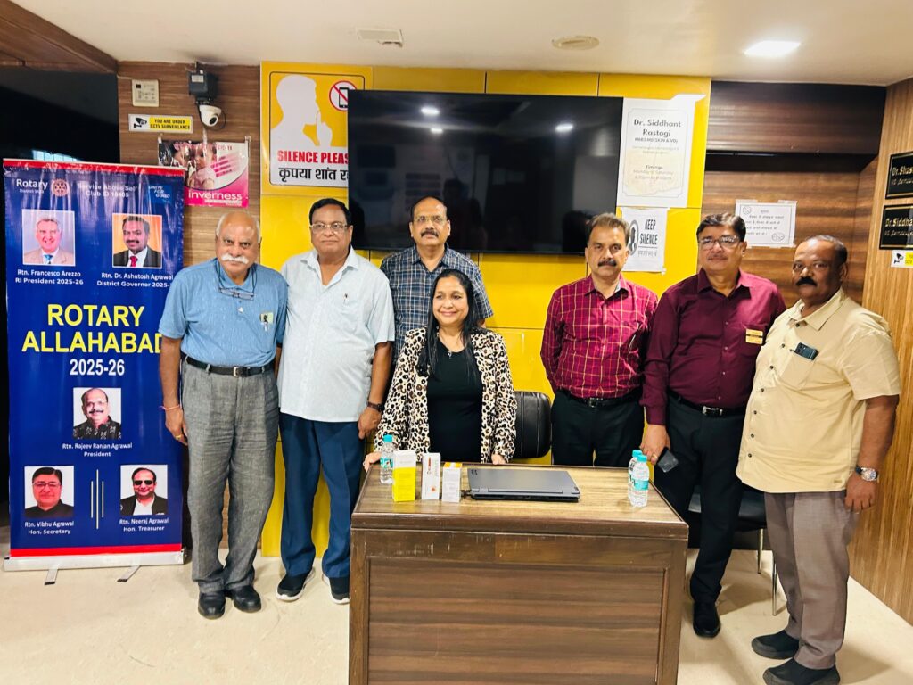 प्रयागराज रोटरी इलाहाबाद के अध्ययक्ष राजीव रंजन अग्रवाल ने समय के चलते अपनी स्किन का कैसे ध्यान रखा जाये इसके लिए एक विशेष कार्यशाला का आयोजन *डॉ शशांक रस्तोगी* के क्लिनिक मे करवाया। उनकी पत्नी *डॉ नलिनी रस्तोगी* -कॉस्मेटोलोजिस्ट जी ने उपास्थित सभी मेंबर्स को पिग्मेंटेशन, झुरिया,दाग , मस्सें, आदि और भी तरह तरह की स्किन से रिलेटेड बातें बताई। उन्होंने कहा हम सब को समय को देखते हुए अपनी स्किन टाइप के अनुसार सनस्क्रीन लगाना चाहिए ।सभी मेंबर्स को लकी ड्रा से फ्री ट्रीटमेंट ,जलपान एवं गिफ़्टस दिये।सचिव विभु अग्रवाल ने उपास्थित डॉक्टर्स और सभी मेंबर्स को धन्यवाद ज्ञापन दिया। सुनील जायसवाल , रवींद्र गुप्ता, देश दीपक आर्या,राकेश वर्मा,तनु अग्रवाल , नैनी, तुलसी, किरण , ममता ,वर्षा,शालिनी ,आलोशी मौजूद रही।