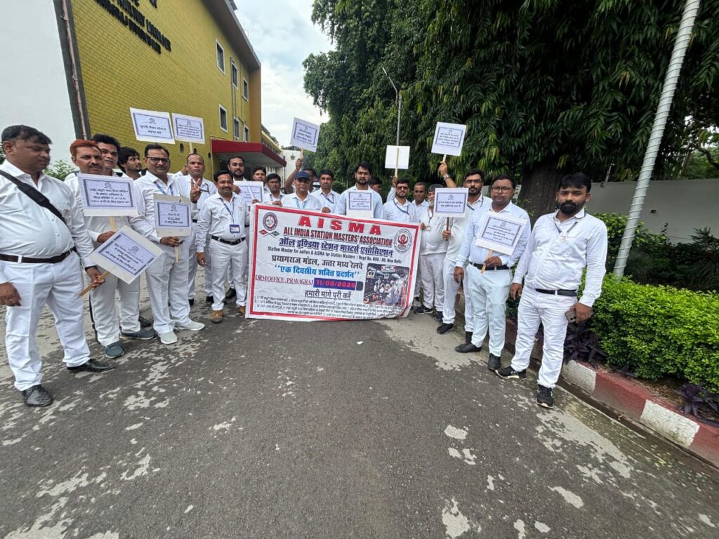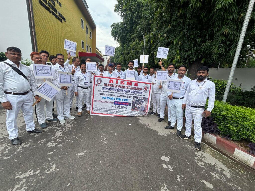 ऑल इंडिया स्टेशन मास्टर्स एसोसिएशन के बैनर तले स्टेशन मास्टरों द्वारा अपनी लंबित मांगों को कैडर पुनर्गठन, रात्रि ड्यूटी भत्ता बिना सीमा के सभी के लिए,पुरानी पेंशन, जोखिम और तनाव भत्ता, शुद्ध पेयजल,कार्यालय सम्बद्ध शौचालय, महिला स्टेशन मास्टर के लिए अलग शौचालय, वस्त्र परिवर्तन कक्ष, रनिंग वाटर सप्लाई जैसे 21 मुद्दों और समस्याओ को लेकर प्रयागराज मण्डल के अंतर्गत आने वाले सभी स्टेशनों में स्टेशन मास्टरों द्वारा शक्ति प्रदर्शन किया गया l मण्डल सचिव ज्ञानेन्द्र कुमार पाण्डेय ने बताया कि प्रत्येक 11 अगस्त को एसोसिएशन द्वारा शक्ति दिवस के रूप में देशभर में मनाया जाता है l आज प्रयागराज मण्डल रेल प्रबंधक कार्यालय में एसोसिएशन के मण्डल व शाखा के 30 पदाधिकारियों द्वारा सांकेतिक धरना प्रदर्शन कर अपनी मांगों का ज्ञापन मण्डल रेल प्रबंधक महोदय, वरिष्ठ मण्डल परिचालन प्रबंधक, वरिष्ठ मण्डल कार्मिक अधिकारी को दिया गया l इस दौरान मण्डल के सभी स्टेशनों पर स्टेशन मास्टरों ने शक्ति बैज पहनकर वृक्षारोपण कर अपनी मांगों व समस्याओं को लेकर विरोध जताया और मण्डल रेल प्रबंधक कार्यालय में धरना दे रहे एसोसिएशन के पदाधिकारियों को समर्थन दिया l इस दौरान स्टेशन मास्टर रेल संचालन कार्य करते रहे l मण्डल अध्यक्ष इंद्रसेन ने बताया कि स्टेशन मास्टर भारतीय रेल में सुरक्षित और संरक्षित रेल संचालन की महत्वपूर्ण कड़ी है किन्तु स्वच्छ पानी, शौचालय जैसी महत्वपूर्ण मूलभूत आवश्यकताओं से वंचित है l जिसके निराकरण के लिए एसोसिएशन ने अपनी प्रतिबद्धता और मांग प्रशासन के समक्ष रखा है भविष्य में यदि इनका जल्द निराकरण नहीं होता है तो भारतीय रेल की धड़कन कहलाने वाले स्टेशन मास्टरों को इस प्रकार के बड़े आंदोलन के लिए विवश होना पड़ेगाl