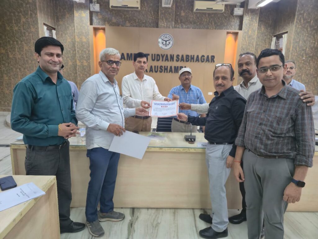 कौशांबी।* मुख्य विकास अधिकारी विनोद राम त्रिपाठी ने उदयन सभागार में क्षेत्रीय प्रबंधक उत्तर प्रदेश ग्रामीण बैंक संजीव कुमार कंचन एवं मुख्य प्रबंधक आशीष राय को प्रशस्ति-पत्र प्रदान कर सम्मानित किया।उपायुक्त उद्योग के.के. अमर ने बताया कि मुख्यमंत्री युवा उद्यमी विकास अभियान योजना/ अन्य शासकीय योजना (PMEGP, ODOP, PMFME,MYSY आदि) के अंतर्गत वित्तीय वर्ष 2025-26 में लक्ष्य 1700 के सापेक्ष अब तक 846 लाभार्थियों को ऋण दिए जाने में अधिकतम योगदान उत्तर प्रदेश ग्रामीण बैंक द्वारा 332 आवेदकों को ऋण उपलब्ध कराया गया है। इस उत्कृष्ट कार्य के लिए क्षेत्रीय प्रबंधक उत्तर प्रदेश ग्रामीण बैंक संजीव कुमार कंचन एवं मुख्य प्रबंधक आशीष राय को प्रशस्ति-पत्र प्रदान कर सम्मानित किया गया।