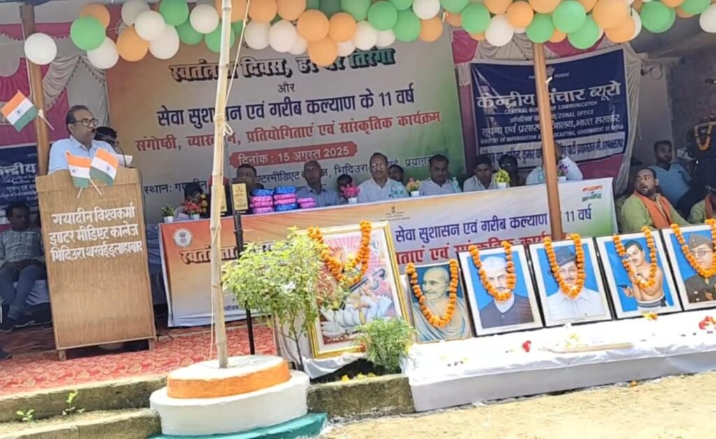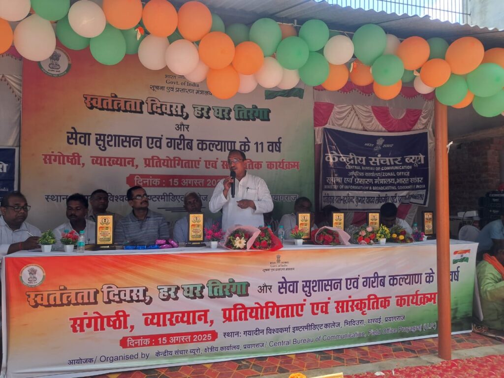 प्रयागराज | केंद्रीय संचार ब्यूरो, सूचना एवं प्रसारण मंत्रालय, भारत सरकार, प्रयागराज तथा अमृत एजुकेशनल एण्ड चैरिटेबल ट्रस्ट के संयुक्त तत्वावधान में आज गयादीन विश्वकर्मा इण्टरमीडिएट कालेज, भिदिउरा, थरवई, प्रयागराज में स्वतंत्रता दिवस, हर घर तिरंगा और सेवा सुशासन एवं गरीब कल्याण के 11 वर्ष के उपलक्ष्य में संगोष्ठी, व्याख्यान, निबंध एवं भाषण प्रतियोगिता एवं सांस्कृतिक कार्यक्रम का भव्य आयोजन किया गया।