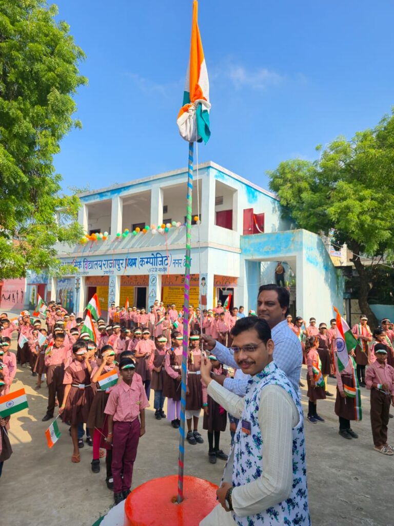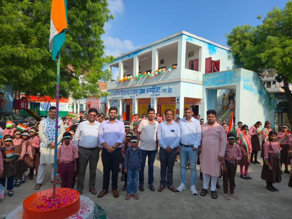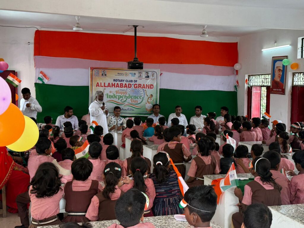 प्रयागराज रोटरी इलाहाबाद ग्रैंड तत्वाधान में 79 स्वतंत्रता दिवस के अवसर पर दिनांक 15 अगस्त को राजापुर स्थित प्राथमिक विद्यालय में रोट्रीयन अध्यक्ष प्रणव विजय अग्रवाल तथा क्लब सेक्रेटरी Rtn. अविरल अग्रवाल जी द्वारा संयुक्त रूप से ध्वजारोहण किया गया। इस अवसर पर बच्चों ने अनेक रंगारंग कार्यक्रम प्रस्तुत किये ।तथा रोटरी के अध्यक्ष प्रणव अग्रवाल ने बच्चों क की उज्जवल भविष्य की कामना की तथा उम्मीद जताई कि यह सभी भावी नागरिक अपनी-अपने कर्तव्यों का पालन करते हुए देश सुरक्षा एवं राष्ट्रीय हित के लिए तन मन से कार्य करेंगे। इस अवसर मे ईशान अग्रवाल,नमोश मित्तल,