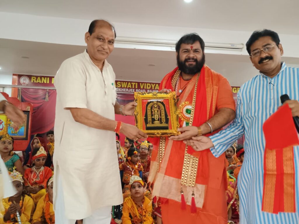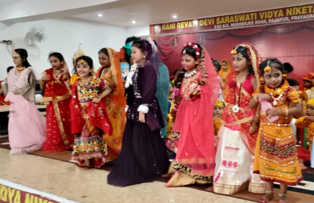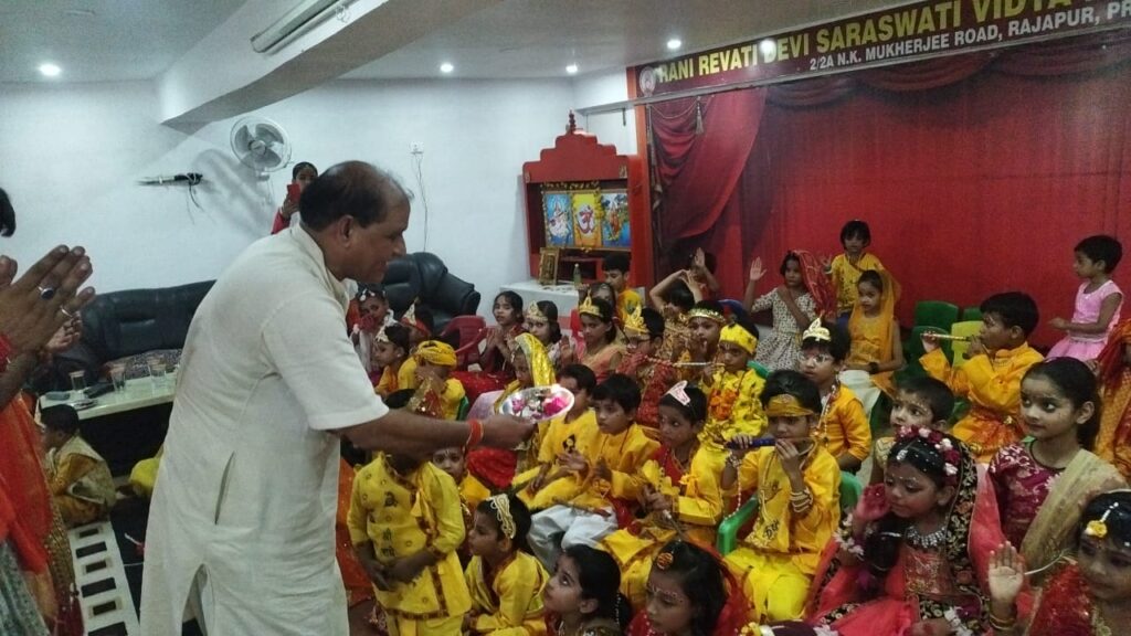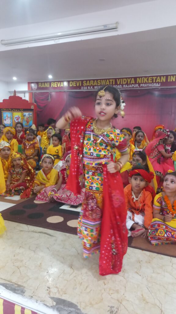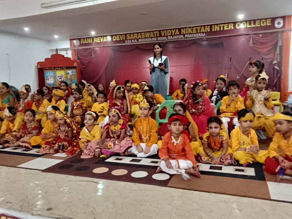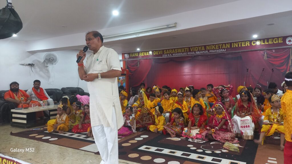 *प्रयागराज l* विद्या भारती से संबद्ध काशी प्रांत के रानी रेवती देवी सरस्वती विद्या निकेतन इंटर कॉलेज राजापुर, प्रयागराज में प्रधानाचार्य बांके बिहारी पाण्डेय के मार्गदर्शन एवं पूजा मिश्रा के संयोजन में श्री राधाकृष्ण रूप सज्जा प्रतियोगिता का आयोजन भजन /कीर्तन और आकर्षक नृत्यों तथा आध्यात्मिक प्रवचन के साथ संपन्न हुआ l रूपसज्जा प्रतियोगिता में लगभग 82 भैया बहनों ने श्री राधा एवं कृष्ण जी की आकर्षक वेशभूषा से सुसज्जित होकर मंच पर अभिनय और नृत्य के माध्यम से सबको भाव विभोर कर दिया l
