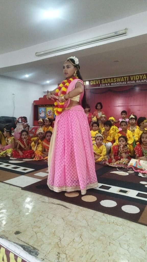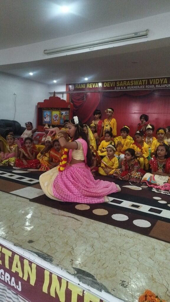 इस अवसर पर संगीताचार्य मनोज गुप्ता के निर्देशन में प्रियांशी श्रीवास्तव ने “ओ कान्हा अब तो मुरली की मधुर सुना दे तान” एवं विप्रा केसरवानी ने भगवान श्री कृष्ण के प्रसंग पर आधारित भावपूर्ण नृत्य कत्थक शैली में तथा श्री कृष्ण और राधा जी की वेशभूषा में सजे नन्हे मुन्ने भैया बहनों ने भी कई आकर्षक नृत्य प्रस्तुत करके सबको मंत्रमुग्ध कर दिया l तबले पर शांतनु पाण्डेय ने बहुत ही सुंदर साथ दिया l