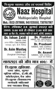 नाज़ हास्पिटल 60 फिट रोड करैली (निकट हमसफर गार्डेन) पर दिनांक 24 जुलाई रविवार को प्रातः 9 से 2 बजे दिन तक एक निशुल्क जाँच परामर्श एवं चिकित्सा शिविर का आयोजन किया गया है जिसमे डॉ नाज़ फातिमा महिला रोग विशेषज्ञ डॉ ईशान ज़ैदी जनरल मेडिसिन ,डॉप्रभात इ एन टी/एच एन एस ,डॉ आसिम मुश्ताक़ सर्जिकल ओनकोलॉजी ,डॉ आनन्द हड्डी रोग विशेषज्ञ निशुल्क चिकित्सा शिविर मे परामर्श देंगे वहीं ब्लड ,शुगर ,यूरिक एसिड ,ई सी जी ,कोलोस्ट्राल ,नेत्र जाँच मुफ्त होगी थाईराइड की जाँच मात्र सौ रुप्ये अदा करने पर होगी।दवाई भी मुफ्त दी जाएगी।उक्त सूचना नाज़ इन्सटीट्यूट ऑफ पैरामेडिकल साईन्सेज़ एण्ड हास्पिटल के मैनेजर सैय्यद मोहम्मद अस्करी ने देते हुए आम जनमानस से निशुल्क जाँच शिविर मे आकर लाभ उठाने की अपील की।