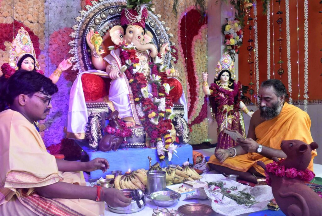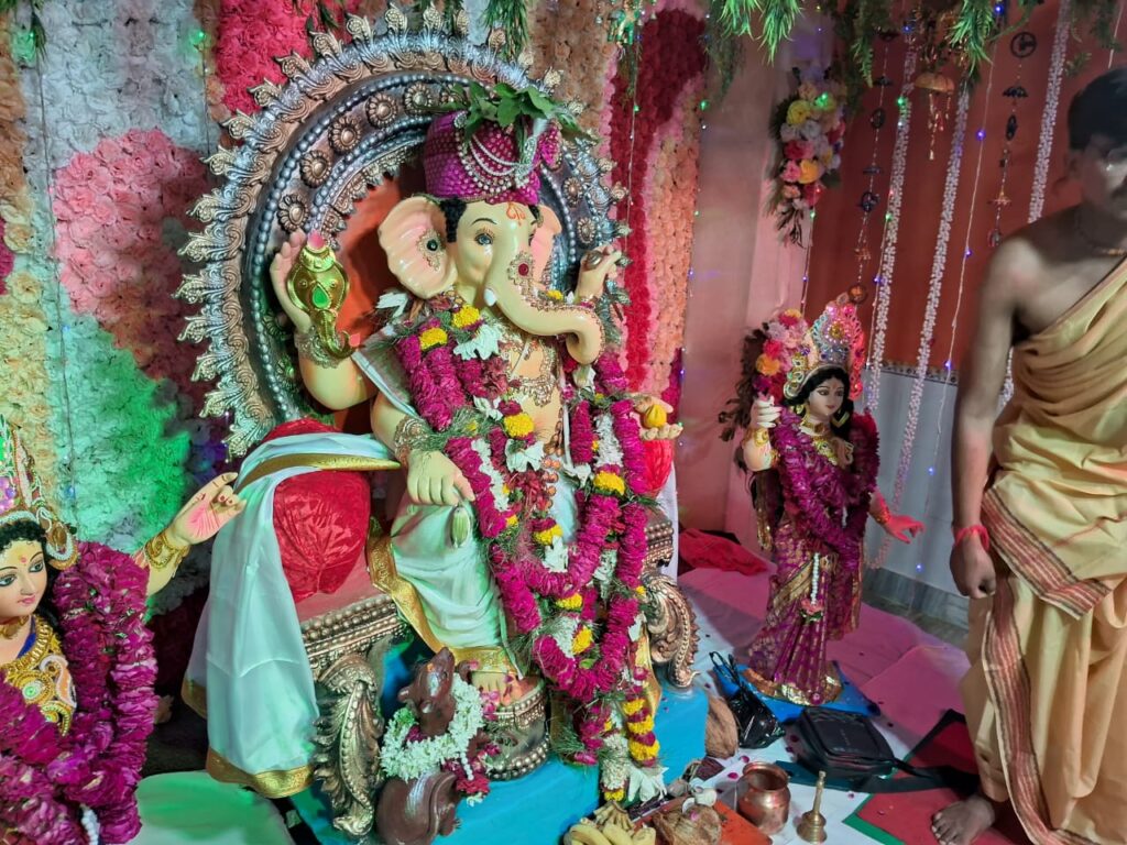 प्रयागराज श्री गणेश जी स्थापना मंत्रोच्चार व अथर्वशीर्ष अवर्तन के साथ मंडल के पुरोहित योगेश पित्रे ने संपन्न कराई।