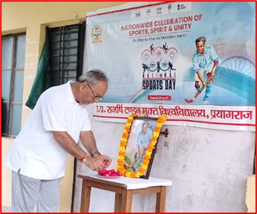 युवा कार्यक्रम और खेल मंत्रालय, भारत सरकार की मंशा एवं विश्वविद्यालय अनुदान आयोग, नई दिल्ली की अपेक्षानुरूप शुक्रवार को उत्तर प्रदेश राजर्षि टण्डन मुक्त विश्वविद्यालय प्रयागराज के सरस्वती परिसर में त्रिदिवसीय राष्ट्रीय खेल दिवस कार्यक्रम का शुभारंभ किया गया। कार्यक्रम में सर्वप्रथम प्रातः 7:30 बजे विश्वविद्यालय के कुलपति, कुलसचिव, शिक्षक, कर्मचारी एवं शोध छात्रों द्वारा मेजर ध्यानचंद के छायाचित्र पर पुष्प अर्पण कर उन्हें श्रद्धांजलि दी गई। तत्पश्चात कुलपति आचार्य सत्यकाम ने विश्वविद्यालय परिवार के सदस्यों एवं शोधार्थियों को स्वस्थ भारत शपथ दिलाई।