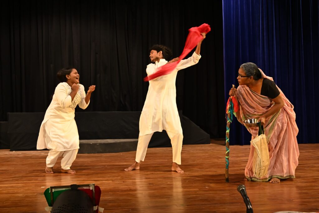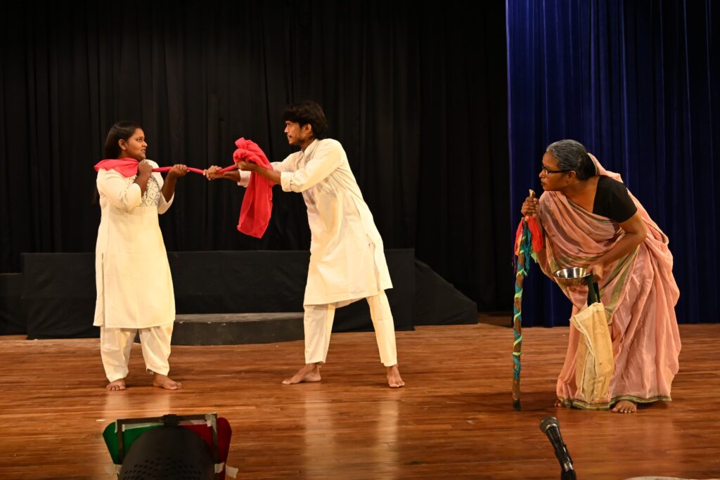युवा बुढ़िया,रामदीन की बेटी की भूमिका में( शीरीन मालवीय), सूत्रधार,रामदीन की भूमिका में (कुमार अभिनव), बूढ़ी माता की भूमिका में (डॉ. सुनीता थापा), कन्हैया उर्फ लंगड़ा की भूमिका में (अभिषेक गुप्ता), नेता जी की भूमिका में (आकाश अग्रवाल “चर्चित”), प्रेमी एवं धारदार की भूमिका में (आकाश मौर्य), प्रेमिका एवं बुधिया माई की भूमिका में (शालिनी मिश्रा), प्रभाकर बाबू की भूमिका में (हर्ष श्रीवास्तव), न्यायादेव की भूमिका में (दिवांकर रॉय), सेविका की भूमिका में (दिव्यांशी अग्रहरि), पुलिस वाला की भूमिका में ( सत्यम मिश्रा) ने अपने सशक्त अभिनय से दर्शकों को अत्यंत प्रभावित किया।संगीत संयोजन प्रशांत वर्मा, रूप सज्जा मोहम्मद हमीद, मोहम्मद इरशाद, मंच निर्माण आरिश जमील,उत्कर्ष गुप्ता,अंकित पाण्डेय, वस्त्र विन्यास डॉ. सुनीता थापा,गरिमा बनर्जी, पोस्टर/कार्ड डिजाइन शहबाज अहमद, मीडिया प्रभारी मनोज कुमार गुप्ता, हस्त सामग्री नबीला, पूर्वाभ्यास प्रबंधक उत्तम कुमार बनर्जी, प्रस्तुति मार्गदर्शन सुदीपा मित्रा का था। नाटक का पुनर्लेखन/ परिकल्पना एवं निर्देशन निखिलेश कुमार मौर्य का था।आयोजन के मुख्य अतिथि श्री सुदेश शर्मा (निदेशक, उत्तर मध्य क्षेत्र सांस्कृतिक केंद्र) थे जबकि कार्यक्रम की अध्यक्षता श्री अनिल रस्तोगी ( वरिष्ठ रंगकर्मी, नाट्य निर्देशक, दूरदर्शन एवं फिल्म अभिनेता)ने की। विशिष्ट अतिथि के रूप में डॉ. विभा मिश्रा ( सहायक निदेशक, लघु उद्योग एवं सूक्ष्म मंत्रालय, भारत सरकार), श्री बांके बिहारी पाण्डेय ( प्रधानाचार्य रानी रेवती देवी सरस्वती विद्या निकेतन इंटर कालेज प्रयागराज), श्री अतुल यदुवंशी ( वरिष्ठ लोक नाट्यविद) शामिल थे।अतिथियों का स्वागत संस्था के केंद्रीय महासचिव जमील अहमद ने किया। कार्यक्रम का संचालन कृष्ण कुमार मौर्य ने किया।