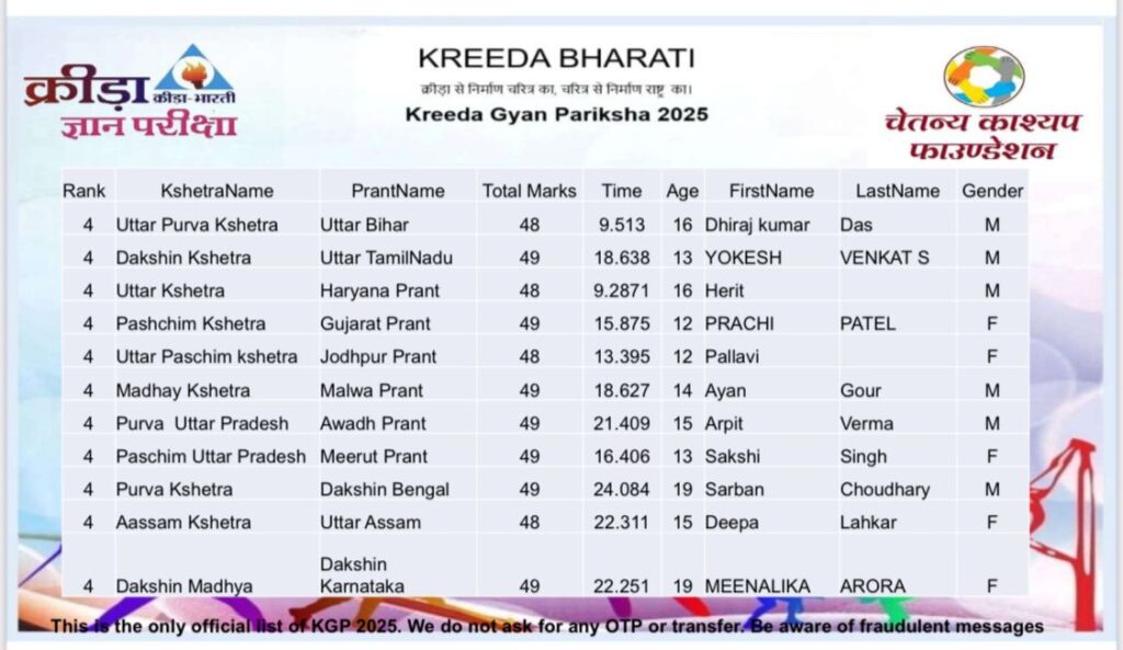 2025 की क्रीड़ा ज्ञान परीक्षा कल 14 सितंबर को सम्पन्न हुई। पूरे भारत के सभी प्रांतोसे और 626 जिलों से 2,28,998 युवक युवतियों ने सहभागिता दी। जिसमे सर्वाधिक 32,000 युवाओं का सहभाग पश्चिम महाराष्ट्र से रहा। शहरों से सहभाग में जोधपुर 14,214 और पुणे 14,191 सबसे आगे रहे।