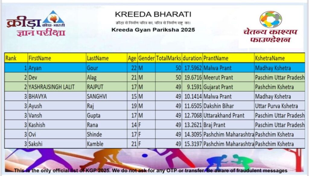 क्रीड़ा ज्ञान परीक्षा 2025, सम्पन्न,मध्य प्रदेश के आर्यन गौर ने प्रथम पुरुस्कार जीता