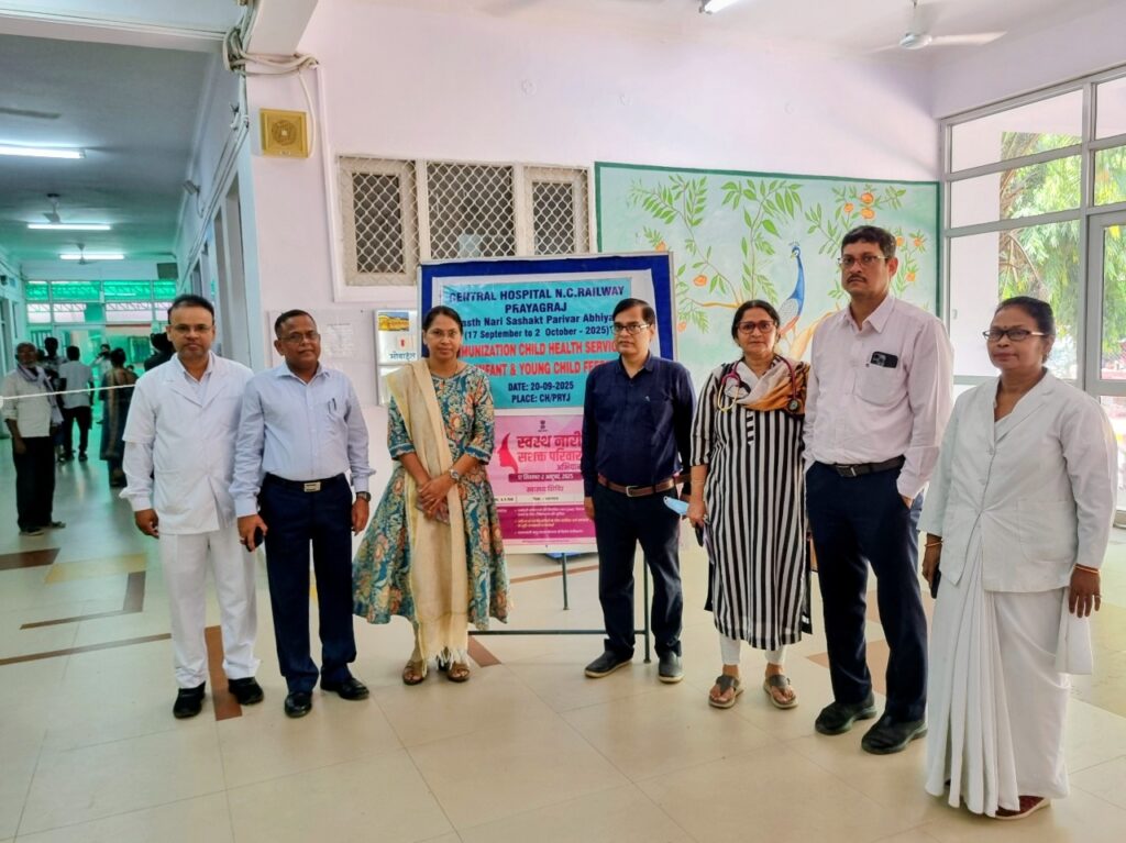 केंद्रीय चिकित्सालय, उत्तर मध्य रेलवे, प्रयागराज में स्वस्थ नारी स्वस्थ परिवार अभियान के चौथे दिन दिनांक 20 सितम्बर 2025 को बच्चों में टीकाकरण तथा खानपान विषय पर कार्यक्रम आयोजित किया गया l इस कार्यक्रम कि अध्यक्षता चिकित्सा निदेशक डॉ. संजीव कुमार हन्डू तथा मुख्य चिकित्सा अधीक्षक डॉ. सुरेन्द्र नाथ ने की I इस कार्यक्रम में अतिरिक्त मुख्य स्वास्थ निदेशक डॉ. अनुराग यादव ने पॉवर पॉइंट प्रेजेंटेशन द्वारा बच्चों में टीकाकरण का महत्त्व तथा संबंधित महत्वपूर्ण जानकारी विस्तृत जानकारी प्रदान की l मुख्य चिकित्सा अधीक्षक डॉ. सुरेन्द्र नाथ ने बच्चों के टीकाकरण तथा खानपान का महत्त्व समझाया l इस कार्यक्रम में अतिरिक्त मुख्य स्वास्थ निदेशक डॉ. उषा यादव, (नोडल ऑफिसर एस. एन. एस. पी. ए.) ने सभा को संबोधित किया और टीकाकरण के बारे में जागरूक किया। कार्यक्रम में 72 बच्चों का टीकाकरण किया गया । चिकित्सा निदेशक डॉ. संजीव कुमार हन्डू ने सभा को सम्बोधित करते हुए कार्यक्रम के महत्त्व की सराहना की और बच्चों के स्वास्थ्य की देखभाल के लिए जागरूक किया l कार्यक्रम में अतिरिक्त मुख्य स्वास्थ निदेशक डॉ. कल्पना मिश्रा, अतिरिक्त मुख्य स्वास्थ निदेशक डॉ. एस. एस. नायक,, मुख्य नर्सिंग अधीक्षक मोदेस्ता टोपनो, मुख्य नर्सिंग अधीक्षक जितेन्द्र कुमार वर्मा, अमित सिंह तथा अन्य अधिकारी एवं कर्मचारी उपस्थित रहे|