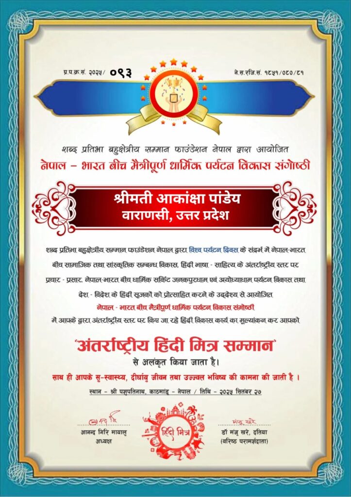बनारस की कवयित्री आकांक्षा पाण्डेय अंतर्राष्ट्रीय पर्यटन दिवस पर ” अंतर्राष्ट्रीय हिंदी मित्र सम्मान ” से हुई सम्मानित