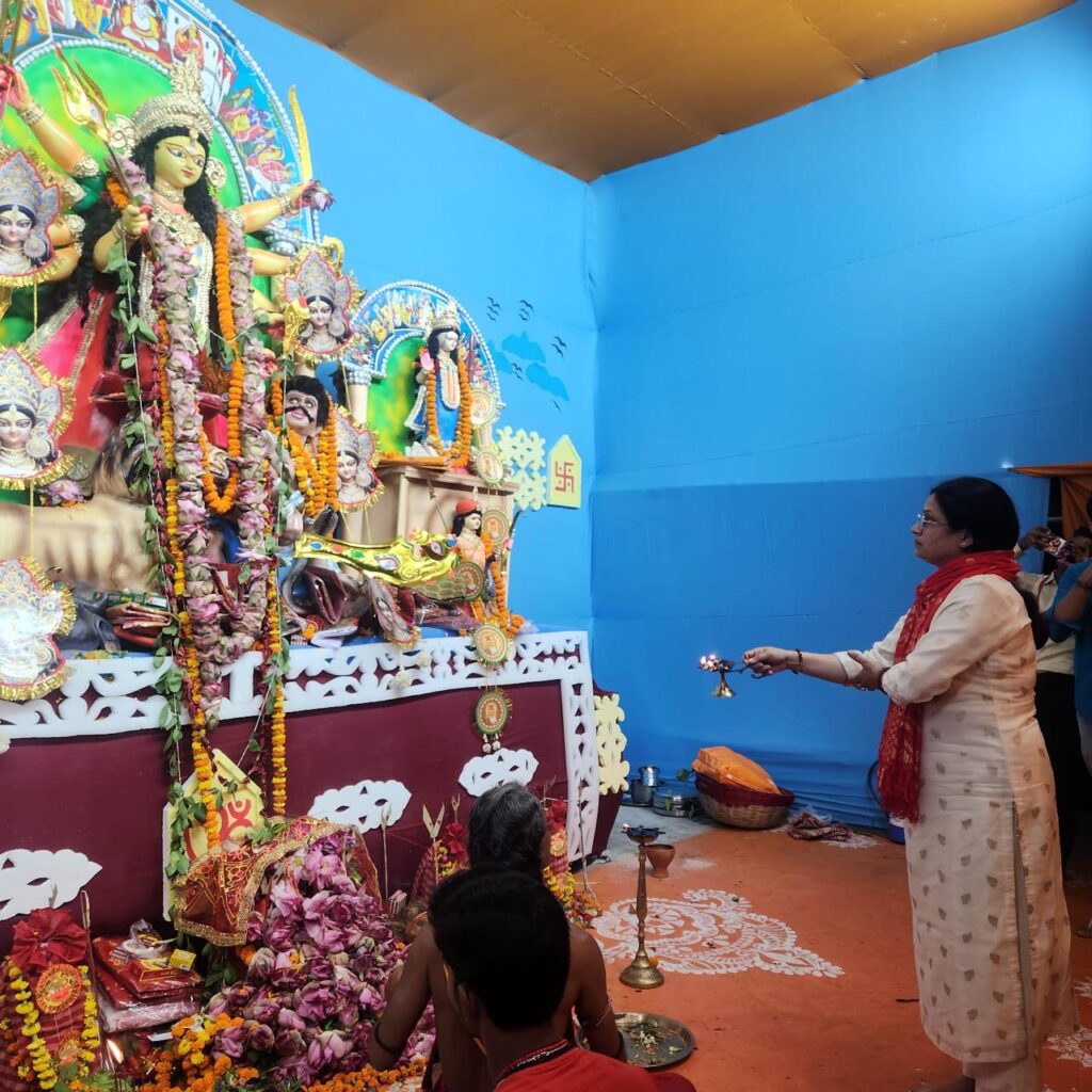 प्रयागराज जी टी बी नगर करैली दुर्गा पूजा पंडाल में डॉक्टर कृतिका अग्रवाल ने पूजा अर्चना आरती किया और कहा कि बंगाल की संस्कृति और परम्पराओं की थीम कलात्मक झांकियों को इस पांडाल में दिखाया गया है यह आकर्षण का केंद्र है इस पांडाल ने मेरा मन मोह लिया सब पंडालों में अलग है, इस अवसर पर कमेटी के पदाधिकारी प्रदीप दत्ता,आलोक घोष,संदीप,ज्ञानेंद्र कुमार श्रीवास्तव, सुबोध श्रीवास्तव, राम कुमार खन्ना,बाबू दादा,ओ पी,अनिल शर्मा,अभिषेक वर्मा उपस्थित रहे.