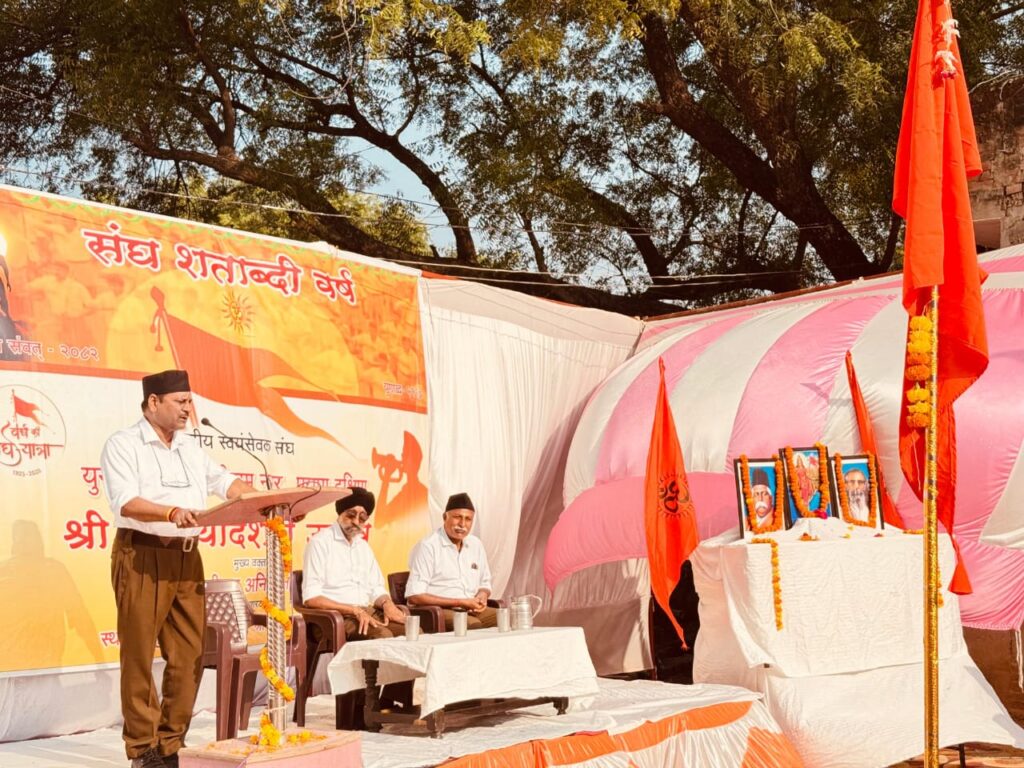 एक समय नागालैंड जैसे राज्य जहां के लोग खुद को भारत से अलग मानते थे। आज वहां की धरती पर तिरंगा यात्रा और भारत माता की जय के जयघोष हो रहे हैं। भारत पाकिस्तान के क्रिकेट मैच में भी भारत भक्ति की भावना खुले मन से प्रकट होती है। उन्होंने कहा कि सौ वर्षों के संघ कार्य का ही परिणाम है कि आज देश के प्रत्येक हिस्से में संघ के स्वयंसेवक समाज निर्माण एवं भारत भक्ति में सक्रिय भूमिका निभा रहे हैं। संघ के ऐतिहासिक संघर्ष और योगदान की चर्चा करते हुए क्षेत्र प्रचारक अनिल जी ने कहा कि एक समय लोग अपने आपको हिंदू कहने में संकोच करते थे, आज गर्व से कहते हैं। केरल जैसे राज्यों में अनेक चुनौतियों के बावजूद संघ कार्यकर्ताओं ने कार्य की बहु विस्तार श्रृंखला स्थापित की है। हजारों स्वयंसेवकों ने संघ की विचारधारा एवं समाज सेवा के लिए त्याग व बलिदान दिया है। विजयादशमी उत्सव का आयोजन भारत की सांस्कृतिक चेतना, राष्ट्रवाद एवं सामाजिक समरसता को मजबूत करने के लिए समर्पित था। ताकि संघ के राष्ट्र प्रथम के मंत्र को गांव गांव तक पहुंचाया जा सके। इस मौके पर मुख्य वक्ता अनिल जी ने शस्त्र पूजन भी किया। विभाग प्रचार प्रमुख वसु ने बताया कि कार्यक्रम में मंच पर भाग संघचालक मिल्कियत सिंह बाजवा, श्रीराम नगर के संघचालक सुरेंद्र मौजूद रहे। संचालन नगर कार्यवाह संदीप ने किया। इस अवसर पर विभाग प्रचारक सुबंधु, विभाग कार्यवाह डा संजय, भाग प्रचारक डा देवदत्त, भाग कार्यवाह मनोज, सह भाग कार्यवाह वीरेंद्र, नगर प्रचारक आशीष, आनंद, मनोज, विवेक और लगभग तीन कार्यकर्ता उपस्थित रहे।