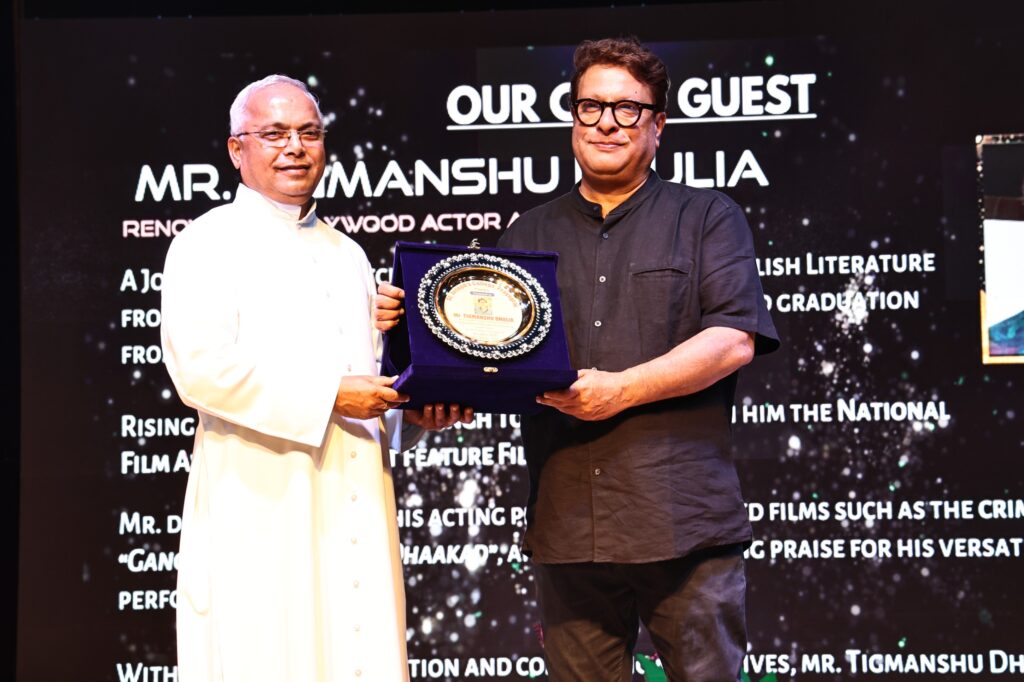 समारोह का मुख्य आकर्षण तब रहा जब मुख्य अतिथि के रूप में हमारे विद्यालय के पुरा छात्र श्री तिग्मांशु धूलिया कार्यक्रम स्थल पर पहुँचे। वे एक सुप्रसिद्ध भारतीय फिल्म निर्देशक, पटकथा लेखक, अभिनेता और निर्माता हैं। उन्होंन सेंट जोसेफ कॉलेज प्रयागराज, इलाहाबाद विश्वविद्यालय और FTII पुणे से शिक्षा प्राप्त की। धूलिया ने अपने करियर की शुरुआत कास्टिंग और सहायक निर्देशक के रूप में की और बाद में “हासिल” (2003) और “पान सिंह तोमर” (2012) जैसी प्रशंसित फिल्मों का निर्देशन किया, जिनमें से “पान सिंह तोमर” को राष्ट्रीय फिल्म पुरस्कार भी मिला। उनकी अन्य उल्लेखनीय कृतियों में “साहेब बीवी और गैंगस्टर”, “बुलेट राजा” और वेब सीरीज़ “रंगबाज़” शामिल हैं। यथार्थवादी निर्देशन, भारतीय समाज की गहरी समझ और बहुमुखी अभिनय के कारण वे आधुनिक भारतीय सिनेमा के प्रमुख व्यक्तित्वों में गिने जाते हैं। उनके आगमन से समारोह की गरिमा और भी बढ़ गई। उनका स्वागत प्रधानाचार्य रेव फादर वॉल्टर डी’सिल्वा ने नवपल्लव और पुष्पगुच्छ भेंट करके किया।