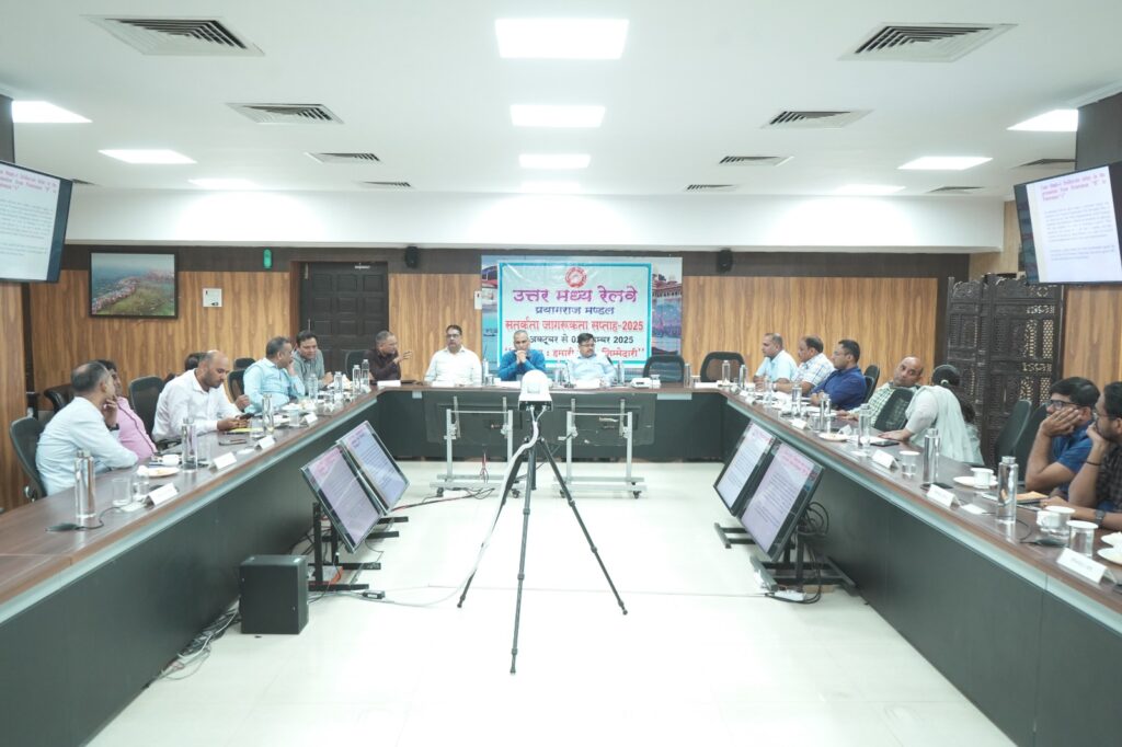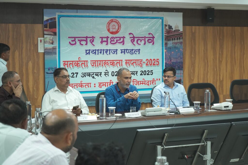 इस क्रम में वरिष्ठ उप महाप्रबंधक सह मुख्य सतर्कता अधिकारी, हिमांशु बडोनी की अध्यक्षता में प्रयागराज मण्डल कार्यालय के संकल्प सभागार में दिनांक 27.10.2025 से 02.11.2025 तक मनाए जा रहे ‘सतर्कता जागरूकता सप्ताह -2025’ के अंतर्गत बैठक का आयोजन किया गया । यह सतर्कता जागरूकता अभियान ‘सतर्कता: हमारी साझी ज़िम्मेदारी’ थीम मनाया जा रहा है। इस बैठक में इस अवसर पर अपर मण्डल रेल प्रबंधक (सामान्य) दीपक कुमार, वरिष्ठ कार्मिक अधिकारी वैभव कुमार गुप्ता, उप मुख्य सतर्कता अधिकारी (स्टोर) इंद्रजीत कटियार; उप मुख्य सतर्कता अधिकारी (ट्रैफिक) जितेंद्र कुमार; उप मुख्य सतर्कता अधिकारी (इंजीनियरिंग) गुंजन श्रीवास्तव एवं उप मुख्य सतर्कता अधिकारी (इलेक्ट्रिक) कृष्ण कान्त उपस्थित एवं अन्य वरिष्ठ अधिकारी रहे ।