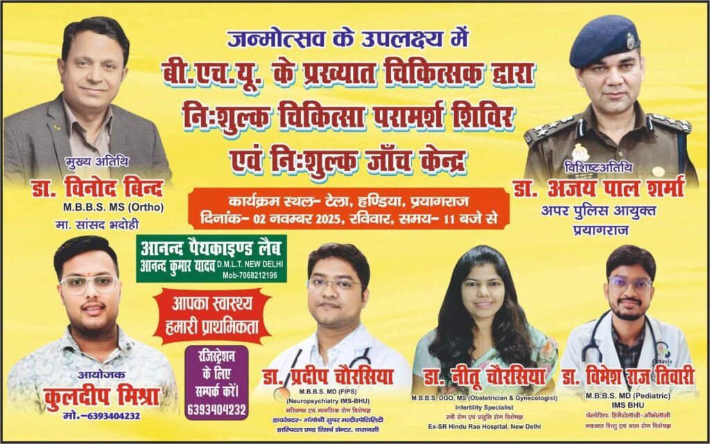 प्रयागराज के हडिया तहसील अंतर्गत ग्राम टेला निवासी कुलदीप मिश्रा जन्म दिवस एवं स्वास्थ्य मेला का आयोजन कर रहे हैं , कुलदीप मिश्रा के ऊपर हाल ही में एक छात्रा से 14 लख रुपए लेकर एमबीबीएस की डिग्री दिलाने का मुकदमा भदोही जनपद में पंजीकृत हुआ था । गौरतलब है कि कुलदीप मिश्रा कई आपराधिक गतिविधि में संलिप्त रहता है, वही 2 तारीख को होने वाले स्वास्थ्य मेला एवं कुलदीप मिश्रा के जन्मदिन के कार्यक्रम में विशिष्ट अतिथि के तौर पर अजय पाल शर्मा एडिशनल पुलिस कमिश्नर प्रयागराज उपस्थित रहेंगे।इस कार्यक्रम में लगभग आयोजक एवं संयोजक सभी किसी न किसी आपराधिक गतिविधि में संलिप्त रहे हैं , अब 2 तारीख को होने वाले इस स्वास्थ्य मेला एवं जन्म उत्सव समारोह में क्या एडिशनल पुलिस कमिश्नर उपस्थित होते हैं, या अपना गरिमा और पद का आवाहन करते हुए एक कड़ी कार्रवाई करते हैं।