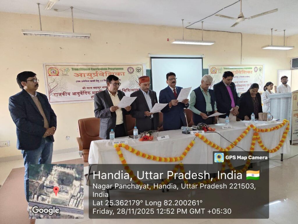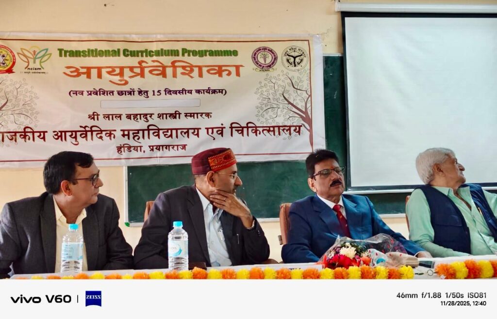 हण्डिया, प्रयागराज: श्री लाल बहादुर शास्त्री स्मारक राजकीय आयुर्वेद महाविद्यालय हण्डिया, प्रयागराज में एनसीआईएसएम द्वारा निर्धारित पन्द्रह दिवसीय आयुर्प्रवेशिका (ट्रांसिशनल करीकुलम) कार्यक्रम का समापन कार्यक्रम हर्षोल्लास के साथ सम्पन्न हुआ । कार्यक्रम की अध्यक्षता संस्था के प्रधानाचार्य डॉ केदार नाथ उपाध्याय ने की । विश्व आयुर्वेद मिशन के संस्थापक अध्यक्ष एवं आरोग्य भारती के राष्ट्रीय उपाध्यक्ष प्रो.(डॉ.) जी एस तोमर मुख्यअतिथि के रूप में इस अवसर पर उपस्थित रहे । सोनेलाल पटेल मेडिकल कॉलेज मिर्जापुर के पूर्व प्रोफेसर डॉ सी एम पाण्डेय ने विशिष्ट अतिथि के रूप में कार्यक्रम की शोभा बढ़ाई । अपने उद्बोधन में डॉ तोमर ने नवप्रवेशित छात्रों को बधाई दी । वर्तमान परिदृश्य में आयुर्वेद की बढ़ती लोकप्रियता पर प्रकाश डालते हुए उन्होंने कहा कि आयुर्वेद भारतीय ज्ञान परम्परा का अभिन्न अंग है । विश्व की प्राचीनतम चिकित्सा पद्धति होने के साथ-साथ यह एक आदर्श जीवन दर्शन है । समय सिद्ध औषधियों के साथ-साथ इसमें बताई जीवनशैली आज सम्पूर्ण विश्व के आकर्षण का केंद्र बन गई है । कोरोना कालखंड के परिणामों ने आयुर्वेद की प्रमाणिकता सिद्ध कर इसे और अधिक लोकप्रिय बना दिया है । आप्तोपदेश, प्रत्यक्ष, अनुमान एवं युक्ति नामक चार प्रमाणों से सिद्ध यह ज्ञान त्रिकाल सिद्ध है । साक्ष्य आधारित शोध की आवश्यकता को पूर्ण करने की दिशा में आज आयुर्वेद में पब्लिक डोमेन में 90 हज़ार से अधिक प्रकाशित शोध पत्र उपलब्ध हैं । डॉ तोमर ने पैंतालीस वर्षों से अधिक के अपने चिकित्सा एवं शोध अनुभवों को साझा करते हुए बताया कि आयुर्वेद न केवल विकृत जीवनशैली जन्य रोगों में अत्यंत प्रभावी है अपितु यह केंसर, गठिया, दमा जैसे जीर्ण एवं दुश्चिकित्स्य रोगों के लिए भी संजीवनी है । विशिष्ट अतिथि के रूप में अपने उद्बोधन में डॉ सी एम पाण्डेय ने बताया कि आयुर्वेद हमारी पारंपरिक चिकित्सा पद्धति है । इसकी कार्मुकता समय सिद्ध है तथापि इसे साक्ष्य आधारित शोध से संपुष्ट करना आज की महती आवश्यकता है । अपने अध्यक्षीय उद्बोधन में डॉ उपाध्याय ने नवप्रवेशित छात्रों के इस आशीर्वाद समारोह में मुख्य अतिथि के रूप में उपस्थित होने के लिए डॉ तोमर का एवं डॉ पाण्डेय का आभार जताया । इस अवसर पर संस्था के वरिष्ठ प्राध्यापक डॉ सामू प्रसाद पाल ने संस्था की ऐतिहासिक पृष्ठभूमि के साथ साथ महाविद्यालय की उपलब्धियों की विस्तृत जानकारी साझा की । समारोह में डॉ राकेश कुमार, डॉ अवनीश पाण्डेय, डॉ अरुण सिंह, डॉ महापात्रा, डॉ बीरबल राम, डॉ डॉ शिप्रा,डॉ निरंजन, डॉ अजय, डॉ परवेज़ एवं डॉ गंगाप्रसाद सहित सभी प्राध्यापक एवं चिकित्साधिकारी एवं समस्त छात्र छात्रा