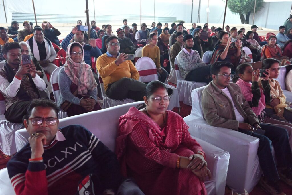 सांस्कृतिक संध्या का शुभारंभ विपिन मिश्रा की शंख-डमरू वादन से हुआ। इसके पश्चात पद्मश्री मालिनी अवस्थी जी ने माँ गंगा को नमन करते हुए जब “मोरे राम जोगिनी बनूंगी” गाया तो पंडाल करतल ध्वनि से गूंज उठा।रेलिया बैरन पिया को लिए जाए रे, मोरे अंगना भवानी आई , हो रामा हो रामा, “केसरिया बालम पधारो म्हारे देस,जैसे गीतों ने शाम को भक्तिरस व लोकधुनों की मिठास से भर दिया। राजा जनक के हारे भीड़ और होली खेले मसाने में और “सावन आया रे, मेघ छाए रे, प्रस्तुत कर समां बांध दिया। लोकनृत्यों की कड़ी में असम से आई स्वागता शर्मा एवं दल ने असम के पारंपरिक नृत्य बिहू की प्रस्तुति देकर वहां की माटी की सुगंध को बिखेरकर खूब तालियां बटोरी। मध्य प्रदेश से आए जुगल किशोर एवं दल ने जनक लियौ रघुरयिया अवध में बाजे बधाइयां गीत पर रगं-बिरंगे परिधान में बधाई, नौरता नृत्य की प्रस्तुति देकर दर्शकों से खूब तालियां बटोरी। हरियाणा से आए प्रदीप कुमार बमनी और साथी कलाकारों ने फागुन आया रंग भरा गीत पर फाग नृत्य की प्रस्तुति देकर देवर भाभी के प्रेम को मंच पर जीवंत किया। झांसी से आई राधा प्रजापति एवं दल ने राई नृत्य की प्रस्तुति दी। वही रामबाबू यादव ने बिरहा भेजी राम को वन में रहले कैअव कारण, बनिके मनिहारी श्याम दौरी सिर पर धारी की प्रस्तुति दी।
