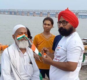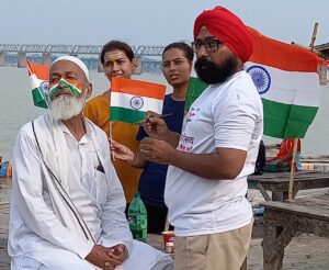 उक्त विचार संगम क्षेत्र में हाथों में तिरंगा,चेहरे पर तिरंगा झंडा बनाकर सर्वधर्म के सहयोगियों के साथ भारतीय जनता पार्टी अल्पसंख्यक मोर्चा काशी क्षेत्र,क्षेत्रीय उपाध्यक्ष सरदार पतविंदर सिंह ने अभियान के उत्सव के उमंग में होश ना खोने के लिए जन-जागरूकता तेज कर दी हैl सरदार पतविंदर सिंह ने अपील करते हुए कहा कि राष्ट्र ध्वज का सम्मान सर्वोपरि बना रहे इसके लिए संवेदनशील रहे अगर कोई राष्ट्र ध्वज कटा-फटा दिखाई दे तो उसका सम्मान पूर्वक निस्तारण करेंl “हर घर का तिरंगा” अभियान में स्कूली बच्चों के साथ आम जनमानस भी विभिन्न गतिविधियों में सम्मिलित रहेगा ऐसे में बड़ी संख्या में राष्ट्रध्वज का उपयोग 13 से 15 अगस्त तक चलने वाला अभियान में होने वाला है इसलिए संभव है कि अनजाने में कटा-फटा राष्ट्रध्वज सड़क या किसी अन्य स्थल पर इधर-उधर दिख जाए ऐसे अज्ञानता के कारण हो सकता हैं