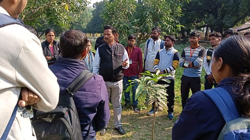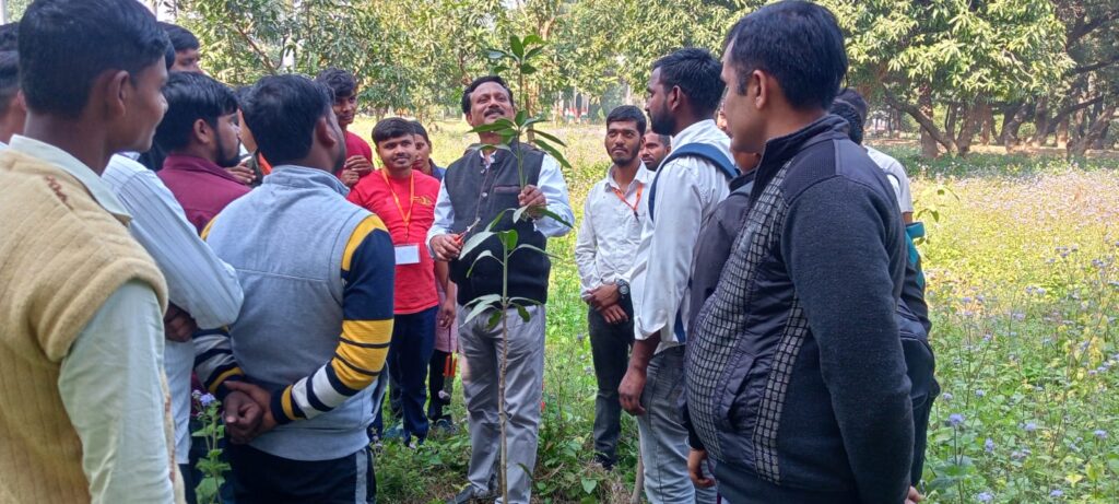 औद्यानिक प्रयोग एवं प्रशिक्षण केंद्र खुसरोबाग प्रयागराज में माली प्रशिक्षण के प्रायोगिक सत्र में डॉ वीरेंद्र सिंह मुख्य उद्यान विशेषज्ञ द्वारा आम के कैनोपी प्रबंधन की जानकारी देते हुए बताया गया कि आम के 6 माह के पौधे हो जाने पर नीचे से 60 सेंटीमीटर की ऊंचाई पर पहली कटाई करते हैं और पौधे के विपरीत दिशाओं की तीन शाखाओं को बढ़ने देते हैं इसके फिर 6 माह बाद पुनः से दूसरी कटाई करते हैं और फिर तीन शाखाओं को आगे बढ़ने देते हैं जो शाखाएं अंदर जाती हैं उनको हटा दिया जाता है बाहर वाली शाखों को छोड़ दिया जाता है जिससे पौधे पर प्रकाश पूरी तरह से पहुंच सके डॉ सिंह ने बताया कि आम के पौधे की कैनोपी प्रबंधन के लिए कटाई करते समय आम के पौधे की शाखा की गांठ के नीचे से काटते हैं जिससे कई शाखाएं निकले और पेड़ सीधा ना जाकर छतरीनुमा में बन जाए, गांठ से ऊपर तभी काटते हैं जब फल लेने हो , इस प्रकार तीन वर्ष में पेड़ का आकार लगभग 8 फीट ऊंचा कैनेपी बनाया जाता है सूखी व रोग ग्रस्त टहनियों को हटा दिया जाता है, प्रूनिंग का कार्य बरसात के बाद सितंबर से दिसंबर माह तक अच्छा माना है, एक बार में 15 से 20% टहनियां की ही छटाई करनी चाहिए जिससे पौधों को भोजन बनाने में समस्या ना उत्पन्न हो, एक पौधे से दूसरे पौधे के बीच की दूरी का 75% ही पौधे की ऊंचाई रखनी चाहिए जिससे दूसरे पौधे को पर्याप्त सूर्य का प्रकाश मिल सके, डॉ सिंह ने चर्चा करते हुए बताया कि पौधे के कटे हुए भाग पर कॉपर ऑक्सिक्लोराइड का लेप लगा देना चाहिएl