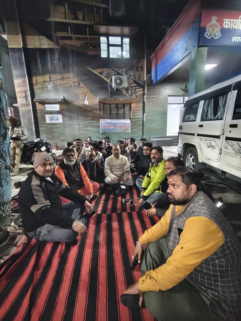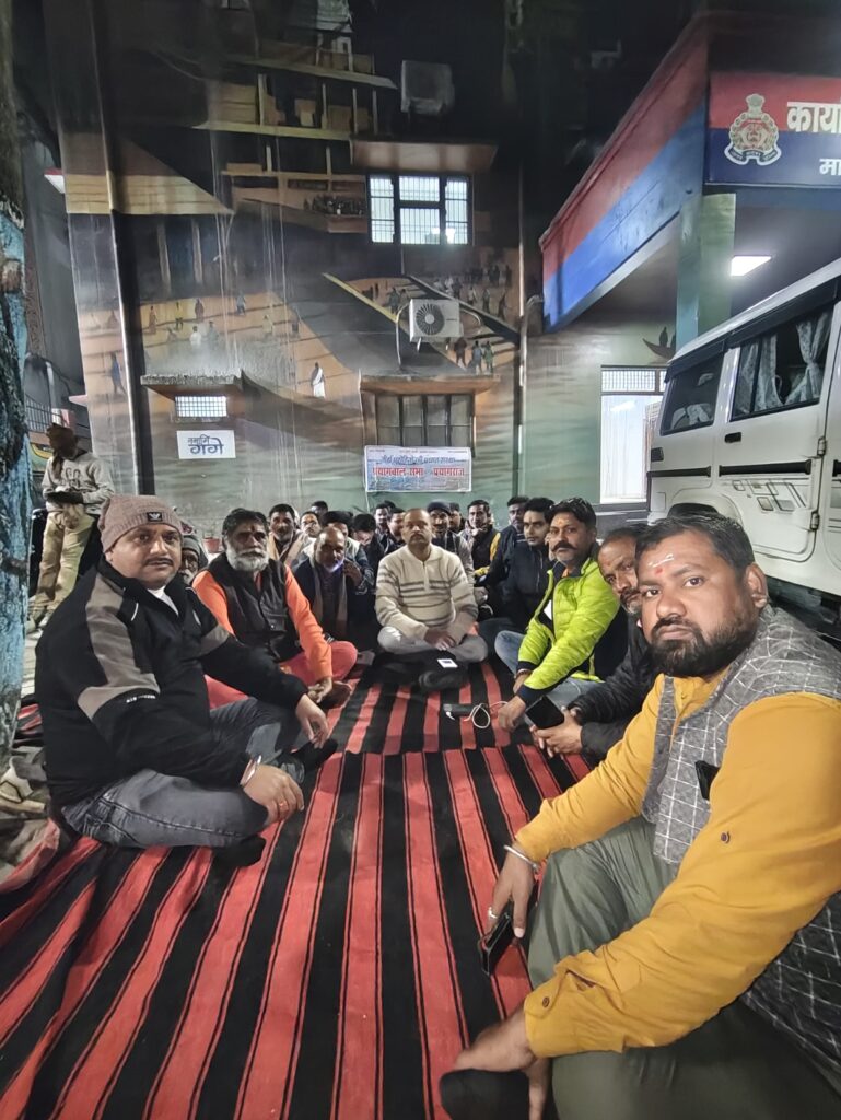 प्रयागराज मेला प्राधिकरण के दफ्तर में अपनी मांगों को लेकर तीर्थ पुरोहित धरने पर बैठे