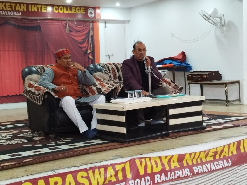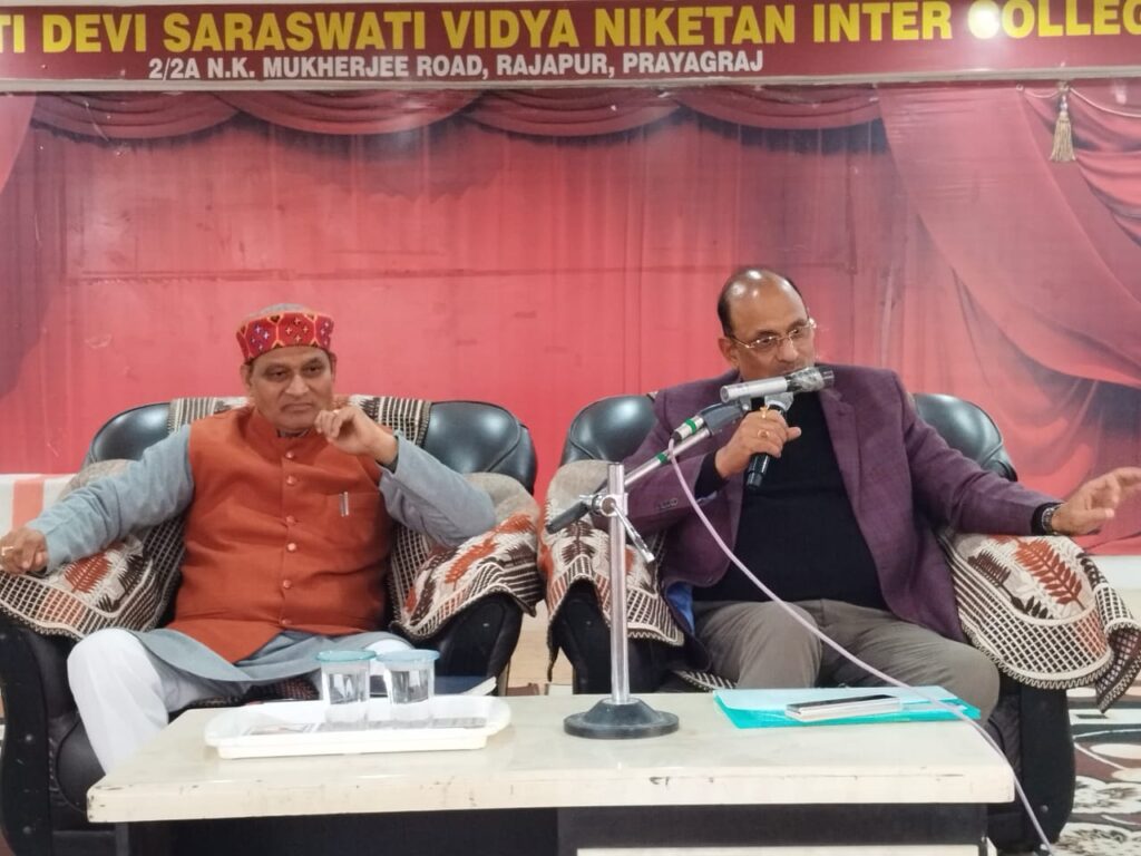 प्रयागराज विद्या भारती से संबद्ध काशी प्रांत के रानी रेवती देवी सरस्वती विद्या निकेतन इंटर कॉलेज राजापुर प्रयागराज में प्रधानाचार्य बांके बिहारी पाण्डेय के संयोजन में विद्या भारती पूर्वी उत्तर प्रदेश के विभिन्न विद्यालयों में गुणवत्ता विकास एवं भैया बहनों के उत्कृष्ट शैक्षिक प्रदर्शन हेतु विद्या भारती पूर्वी उत्तर प्रदेश के अध्यक्ष एवं माध्यमिक शिक्षा परिषद के पूर्व सचिव दिव्यकांत शुक्ल ने हाई स्कूल एवं इंटर के भैया बहनों को अभिप्रेरित करने के क्रम मे आज परीक्षा पे चर्चा के क्रम में विद्यालय में आयोजित कार्यक्रम में भैया बहनों से प्रत्यक्ष संवाद किया । कार्यक्रम का शुभारंभ मां सरस्वती जी की वंदना से हुआ तत्पश्चात प्रधानाचार्य बांके बिहारी पाण्डेय ने दिव्यकांत शुक्ल को अंगवस्त्रम एवं स्मृति चिन्ह देकर सम्मानित किया l