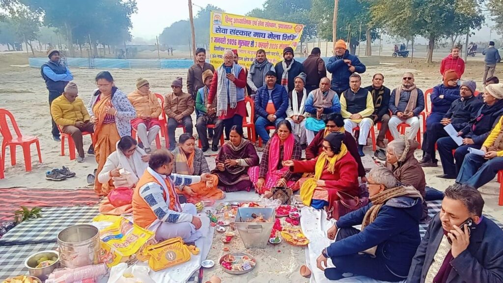 प्रयागराज। हिन्दू आध्यात्मिक एवं सेवा संस्थान के माघमेला शिविर का विधिवत भूमि पूजन सोमवार को हुआ। वेदपाठी ब्राह्मणों के ब्राह्मणत्व एवं संस्थान के क्षेत्रीय संयोजक एवं वरिष्ठ प्रचारक अमरनाथ के नेतृत्व में शिविर का भूमि पूजन हुआ। हिन्दू आध्यात्मिक एवं सेवा संस्थान के उपाध्यक्ष नागेंद्र जायसवाल सपत्नीक यजमान के रूप में उपस्थित रहे। भगवान श्री नारायण के स्मरण एवं प्रथम आराध्य गणपति की स्तुति एवं हवन तथा भगवान के जयकारा से सभा स्थल गुंजित हो उठा। कार्यक्रम में डेढ़ सौ से अधिक जनमानस तथा मातृशक्ति की उपस्थिति उत्साह वर्धक रही। भगवान के प्रसाद को ग्रहण करते हुए संस्थान ने संकल्प लिया कि माघ मेला के प्रत्येक शिविर में वन्दे मातरम एवं गीता का सस्वर पाठ नित्य होना चाहिए। कार्यक्रम में क्षेत्रीय संयोजक अमरनाथ, भारत स्काउट गाइड विद्यालय के प्रधानाचार्य डॉ योगेश त्रिपाठी, डॉ सुशील सिन्हा, संजय शुक्ला, नागेंद्र जायसवाल, गंगा दत्त जोशी, भोला तिवारी, वंदना तिवारी, अरुण दुबे, अनीता तिवारी, पवन दुबे, सौरभ दुबे, अमित तिवारी, सुरेश यादव, सुनीता सिंह, आकाश पाण्डेय, भाव्यांश अग्रवाल, राहुल पाण्डेय, मनीष द्विवेदी आदि रहे।