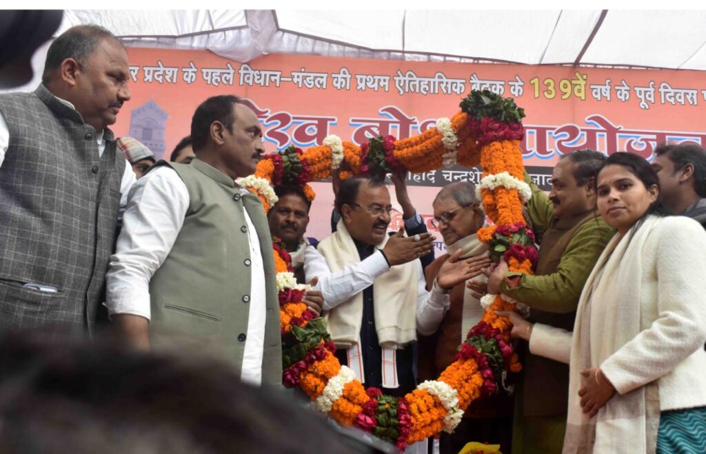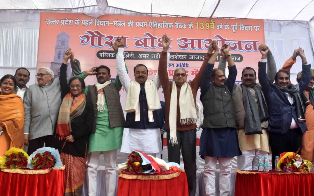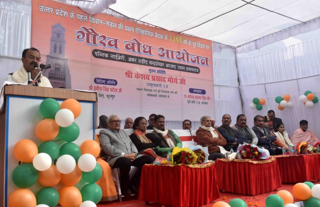 प्रयागराज उत्तर प्रदेश विधान मंडल दल की पहली बैठक के 139 वें वर्ष पूरे होने पर अमर शहीद चंद्रशेखर आजाद पार्क की ऐतिहासिक पब्लिक लाइब्रेरी में आयोजित गौरव बोध कार्यक्रम में बतौर मुख्य अतिथि शामिल प्रदेश के डिप्टी सीएम केशव प्रसाद मौर्य ने कहा कि ये एतिहासिक कार्यक्रम है। 139 वर्ष पहले विधान मंडल दल की बैठक हुई थी। 150 वीं वर्षगांठ भी मनाएंगे। प्रयागराज की गौरव गाथा के बारे में लोगों को बताएं उन्हें जानकारी दें। आज श्रृंगवेरपुर धाम, अक्षय वट, भरद्वाज ऋषि आश्रम चमक रहा है। अमर शहीद चंद्रशेखर आजाद के बलिदान की स्थली है ये पार्क। वीर क्रांतिकारियों ने विकसित भारत विशुगुरु भारत के लिए बलिदान दिया। इस संकल्प को हम पूरा करने का संकल्प लें। 8 जनवरी 1887 में उत्तर प्रदेश विधान मंडल दल की पहली बैठक प्रयागराज में हुई थी। उस विद्वान् मंडल दल की बैठक में शामिल 4 भारतीयों को नमन करता हूं। ऐसे कार्यक्रमों को और बड़ा स्वरूप देने का काम करना है। प्रयाग में क्या था क्या है और क्या होना चाहिए इस पर विचार कीजिए। डबल इंजन की सरकार का खजाना प्रयागराज के लिए खुला है। बड़े बड़े अपराधी माफिया आज बिल्ली बने घूम रहे हैं। ये कानून व्यवस्था कमल खिलने से कायम हुई। हजारे पुरखों के कारण प्रयागराज विश्व के मानचित्र पर है। स्वतंत्रता संग्राम के आंदोलन का केंद्र रहा है। अशोक सिंहल की कर्मभूमि रही है। आने वाली पीढ़ियों के लिए हमें प्रयागराज को विकसित बनाना है। जिला से लेकर क्षेत्र पंचायत तक वन्देमातरम की चर्चा करें। विपक्ष के पास न मुद्दा है न कार्यकर्ता। उनके पास अच्छे लोग जाना नहीं चाहते। हर बूथ पर जाकर सजगता से कार्य करें कार्यकर्ता। हम अपनी गौरवगाथा को न भूलें। मतदाता सूची शुद्धिकरण का हिस्सा बने। विपक्ष ने 2024 में झूठा मुद्दा बनाया कि मोदी संविधान खत्म कर देंगे। संविधान की हत्यारी है कांग्रेस। लोकतंत्र पर प्रहार करने वाले ज्ञान न दें। पीएम मोदी का सिद्धांत है। डबल इंजन की सरकार भेदभाव नहीं करती। भाजपा डॉ भीमराव अंबेडकर की पुजारी है। हम एक भारत श्रेष्ठ भारत के लिए काम करते हैं। पश्चिम बंगाल में कमल खिलने जा रहा। 2027 में प्रयागराज की सभी 12 सीटें जीतेंगे। प्रयागराज को विकास के उच्च स्तर तक ले जाना है। विपक्ष लोकतंत्र का दुश्मन है। कार्यक्रम का संचालन फाफामऊ विधायक गुरु प्रसाद मौर्य ने किया। कार्यक्रम के सूत्रधार व्रतशील शर्मा रहे। इससे पहले भाजपा प्रयागराज महानगर अध्यक्ष संजय गुप्ता के नेतृत्व में कार्यकर्ताओं ने माला पहनाकर डिप्टी सीएम व उपस्थित अतिथियों का स्वागत अभिनंदन किया। कार्यक्रम में प्रमुख रूप से महापौर गणेश केसरवानी गंगापार जिलाध्यक्ष निर्मला पासवान, फुलपुर सांसद प्रवीण पटेल, डॉ नरें