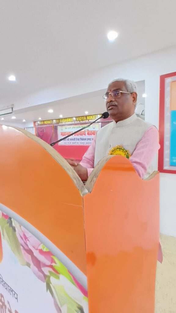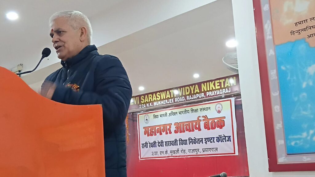 *प्रयागराज l* विद्या भारती से संबद्ध काशी प्रांत के रानी रेवती देवी सरस्वती विद्या निकेतन इंटर कॉलेज के सभागार में विद्यालय के प्रधानाचार्य बांके बिहारी पाण्डेय के संयोजन में विद्या भारती द्वारा संचालित प्रयाग महानगर के समस्त विद्यालयों के लगभग 450 आचार्यों एवं आचार्या बहनों की बृहद बैठक तथा इसके पश्चात महानगर के समस्त शिशु एवं विद्या मंदिरों के प्रधानाचार्यों एवं प्रबंध समितियों की बैठक ज्वाला देवी में संपन्न हुई। इस बैठक का मुख्य उद्देश्य वर्तमान शैक्षिक परिदृश्य और राष्ट्रीय शिक्षा नीति (NEP) 2020 के प्रभावी क्रियान्वयन पर चर्चा करना था।
