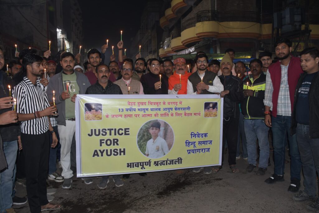 प्रयागराज चित्रकूट के बरगढ़ में 13 वर्षीय मासूम बालक आयुष केसरवानी की जघन्य हत्या हुई थी। इस घटना से पूरे क्षेत्र में शोक और आक्रोश का माहौल है उसकी आत्मा को शांति के लिए कीडगंज में सर्व समाज के भाइयों द्वारा कैंडल मार्च नेता नगर चौराहा, से कीडगंज से पुलिस बूथ चौराहा, कीडगंज निकाला गया, इस कैंडल मार्च में आयुष की आत्मा को शांति देना था और उसकी आत्मा की शांति के लिए प्रार्थना की