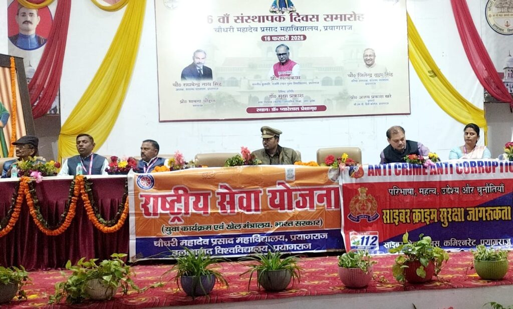 प्रयागराज, राष्ट्रीय सामाजिक संगठन एंटी क्राईम एंटी करप्शन, यातायात निदेशालय उत्तर प्रदेश व आयुषी फाउण्डेशन के संयुक्त तत्वावधान में सीएमपी महाविद्यालय, प्रयागराज में साइबर एवं यातायात जागरूकता अभियान चलाकर छात्र- छात्राओं सहित शिक्षक, शिक्षिकाओं को जागरुक किया गया, यातायात पुलिस निदेशालय एवं प्रयागराज यातायात पुलिस के कुशल पर्यवेक्षण में निर्गत निर्देश के तहत चलाए जा रहे यातायात जागरूकता अभियान के क्रम में मुख्य वक्ता यातायात पुलिस निरीक्षक पवन कुमार पाण्डेय ने चौधरी महावीर प्रसाद महाविद्यालय, प्रयागराज में मुख्य अतिथि राष्ट्रीय प्रमुख अवधेश निषाद, विशिष्ट अतिथि डॉ श्याम देव, राष्ट्रीय उपाध्यक्ष एवं आयुषी फाउण्डेशन के अध्यक्ष, विशिष्ट अतिथि विमल गुप्ता राष्ट्रीय सचिव, डॉ पूजा गौड़ कार्यक्रम अधिकारी राष्ट्रीय सेवा योजन, डॉ सपना मौर्या कार्यक्रम अधिकारी राष्ट्रीय सेवा योजन, डॉ राजेश कुमार रावत मुख्य कार्यक्रम अधिकारी की उपस्थिति में यातायात जागरूकता अभियान के अंतर्गत प्रशिक्षित किया गया।