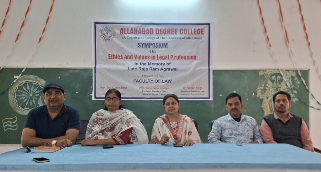 उत्तर प्रदेश सरकार के पूर्व महाधिवक्ता कीर्ति शेष श्री राजाराम अग्रवाल जी की स्मृति में विधि विभाग(बेनीगंज परिसर,इलाहाबाद डिग्री कॉलेज) द्वारा आज मंगलवार 17 फरवरी 2026 को ‘एथिक्स एंड वैल्यूज़ इन लीगल प्रोफेशन’ विषयक विचार गोष्ठी तथा निबंध प्रतियोगिता का आयोजन हुआ।