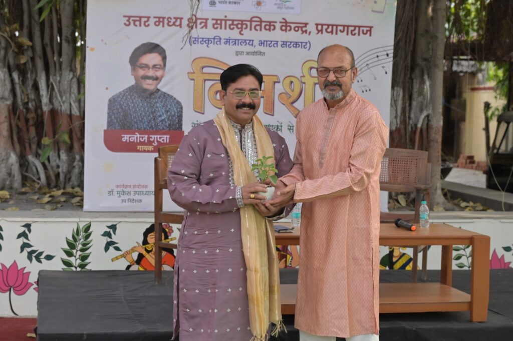 प्रयागराज। “सुरों को साधने के लिए निरंतरता ही एकमात्र मंत्र है। चाहे 15 मिनट ही सही, लेकिन रियाज़ रोज़ होना चाहिए। बिना राग और ताल की बुनियादी नींव के संगीत की इमारत नहीं टिकती।” उक्त बातें शनिवार को संगीत नाटक अकादमी पुरस्कार के लिए चयनित प्रसिद्ध गायक मनोज गुप्ता ने व्यक्त किए। उत्तर मध्य क्षेत्र सांस्कृतिक केंद्र, संस्कृति मंत्रालय द्वारा आयोजित ‘विमर्श’ कार्यक्रम में मुख्य वक्ता के रूप में बोलते हुए उन्होंने अपनी 38 वर्षों की लंबी संगीतमय यात्रा के अनुभव साझा किए।