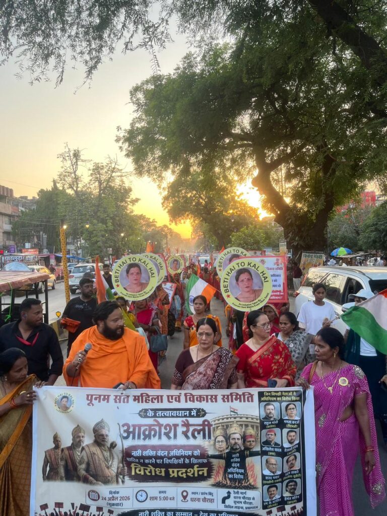 पूनम संत महिला एवं विकास समिति के तत्वावधान में नारी शक्ति वंदन अधिनियम (महिला आरक्षण बिल) को पारित न किए जाने के विरोध में एक विशाल आक्रोश रैली निकाली गई। रैली की शुरुआत धरना चौराहा से होकर सुभाष चौराहा, सिविल लाइंस, प्रयागराज तक की गई, जिसमें बड़ी संख्या में संस्था के पदाधिकारी, सखियाँ, मातृशक्ति एवं गणमान्य नागरिकों ने सहभागिता की।
