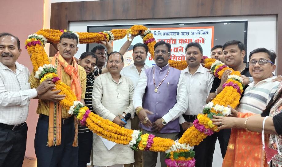 प्रयाग उत्थान समिति के द्वारा राष्ट्र हनुमंत कथा के सफल आयोजन को लेकर ठाकुर हरनारायण सिंह डिग्री कॉलेज कऱैलाबाग के सभागार में आयोजित किया गया इस अवसर समिति के अध्यक्ष एवं ठाकुर हरनारायण सिंह ग्रुप आफ कालेज के डायरेक्टर डा उदय प्रताप सिंह ने राष्ट्र हनुमंत कथा में सेवा कार्य में लगे सभी स्वयंसेवी संगठन और समिति के सेवादारों को कर्म योगी सम्मान से सम्मानित करते हुए कहा कि राष्ट्र हनुमंत कथा सनातन संस्कृति की नवचेतना जन समन्दर बना जिसकी सफलता स्वयंसेवी संगठन और समिति के कार्यकर्ताओं को जाता है जिनके परिश्रम से कार्यक्रम सफल हुआ है। इस अवसर पर पूर्व पार्षद विजय वैश्य ने डा उदय प्रताप सिंह को चांदी का मुकुट और व्यापारी नेता उमेश चंद्र केसरवानी दादा, राजेश केसरवानी एवं रमेश चंद्र केसरवानी ने मोती की माला पहनाकर अभिनंदन किया और सफल आयोजन की बधाई दी