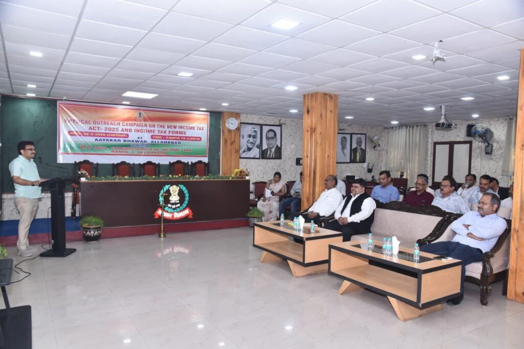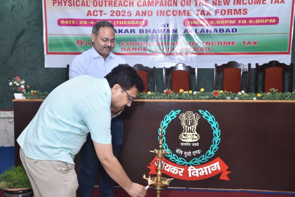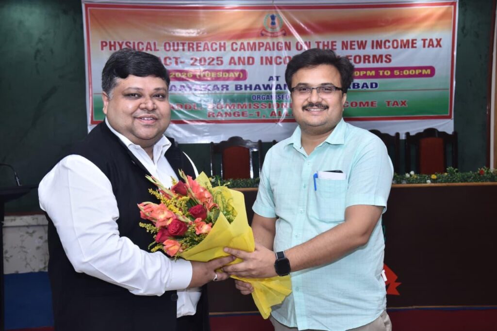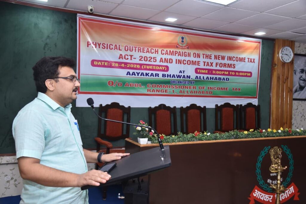केन्द्रीय प्रत्यक्ष कर बोर्ड के द्वारा जारी पत्र दिनांक 31.12.2025 के अनुपालन में आज दिनांक 28.04.2026 को मानस मेहरोत्रा, प्रधान आयकर आयुक्त, इलाहाबाद के निर्देशन में शिव कुमार राय, आयकर आयुक्त (मु.)(ओएसडी), कार्यालय मुख्य आयकर आयुक्त, इलाहाबाद की उपस्थिति में अतुल कुमार पाण्डेय, अपर आयकर आयुक्त, परिक्षेत्र-1, इलाहाबाद द्वारा ‘फिजिकल आउटरेच कैंपेन ऑन द न्यू इनकम टैक्स एक्ट एंड इनकम टैक्स फॉर्म्स ’ कार्यक्रम का आयोजन संगम नगरी प्रयागराज में किया गया। इस कार्यक्रम में सी.ए. एसोसिएशन, इलाहाबाद, बार एसोसिएशन, इलाहाबाद, व्यापार मण्डल, इलाहाबाद के सदस्यों ने उत्साहपूर्वक भाग लिया। कार्यक्रम के दौरान सी.ए. एसोसिएशन, इलाहाबाद, बार एसोसिएशन, इलाहाबाद, व्यापार मण्डल, इलाहाबाद के सदस्यों द्वारा श्री शिव कुमार राय, आयकर आयुक्त (मु.)(ओएसडी), कार्यालय मुख्य आयकर आयुक्त, इलाहाबाद एवं अतुल कुमार पाण्डेय, अपर आयकर आयुक्त, परिक्षेत्र-1, इलाहाबाद का अभिवादन किया गया।