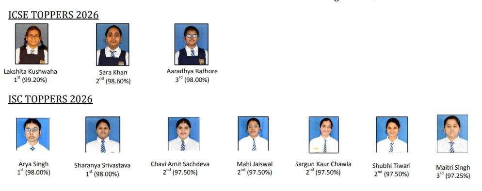 आईसीएसई में लक्षिता कुशवाहा ने 99.2% अंक प्राप्त कर प्रथम स्थान हासिल किया, जबकि सारा खान (98.6%) और आराध्या राठौर (98.0%) ने भी शानदार प्रदर्शन किया। वहीं आईएससी में आर्या सिंह और शारन्या श्रीवास्तव ने 98% अंक प्राप्त कर विद्यालय का मान बढ़ाया।