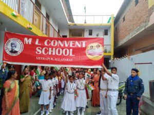 एम एल काॅन्वेन्ट समूह के सभी विद्यालयों में स्वतंत्रता दिवस का 76वाँ समारोह बड़े ही हर्ष एवं उल्लास से मनाया गया। इस वर्ष “आजादी का अमृत महोत्सव” के अन्तर्गत 11 अगस्त 22 से ही विभिन्न प्रकार के कार्यक्रम प्रार्थना के पश्चात् आयोजित किये जा रहे थे। देशभक्ति से सम्बन्धी स्किट, देशभक्ति समूह गान, स्लोगन, देशभक्तों से सम्बन्धी भाषण प्रतियोगिता में बच्चों ने भाग लिया। प्रार्थना के समय ही सभी बच्चों ने “विजयी विश्व तिरंगा प्यारा” गीत का भी सामूहिक गान किया।