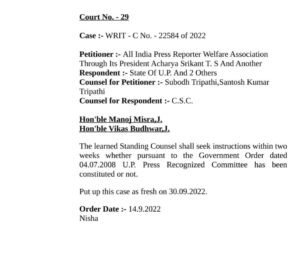 सूचना एवं जनसंपर्क विभाग उ.प्र. की ओर से दिनांक 6 जून 2020 को प्रेस मान्यता समिति गठित करने के लिए एक विज्ञापन जारी किया गया था, उक्त के संदर्भ में प्रदेश के अन्य संगठनों के साथ आंल इंडिया प्रेस रिपोर्टर वेलफेयर एसोसिएशन (ऐप्रवा) की ओर से भी आवेदन किया गया था। उक्त समिति के गठन में हो रही देरी के सम्बन्ध में ऐप्रवा की ओर से मुख्यमंत्री सहित प्रदेश के आला अधिकारियों को पत्र भेजा था जिसमें उत्तर प्रदेश शासन ने ऑल इंडिया प्रेस रिपोर्टर वेलफेयर एसोसिएशन (ऐप्रवा) को सम्मिलित करने के लिए एक पत्र निदेशक सूचना एवं जनसंपर्क विभाग, उ.प्र. को भेजा था। जिसके बावजूद भी कोई कार्यवाही न होने पर, ऐप्रवा की ओर से इलाहाबाद उच्च न्यायालय में फरवरी 2022 में एक याचिका दाखिल की गई जिसमें उच्च न्यायालय ने उत्तर प्रदेश शासन से मान्यता समिति के गठन के लिए जवाब मांगा जिसमें शासन की ओर से यह बताया गया था कि वर्तमान में उत्तर प्रदेश में आचार संहिता लागू होने के कारण नई सरकार बनने के बाद ही प्रेस मान्यता समिति का गठन करने की कार्यवाही हो पाएगी। इस जानकारी के बाद कोर्ट ने यह कहते हुए याचिका निस्तारित किया था कि यदि सरकार बनने के बाद मान्यता समिति गठित नहीं होती तो याची फिर याचिका दायर कर सकता है। यह आदेश न्यायमूर्ति मनोज गुप्ता व न्यायमूर्ति शेखर कुमार यादव की खंडपीठ ने दिया था। नई सरकार बनने पर ऐप्रवा के अधिवक्ता संतोष कुमार त्रिपाठी की ओर से अनुस्मारक/स्मरण पत्र शासन को भेजा गया जिसके बावजूद भी उ.प्र.मान्यता समिति का गठन नहीं हो पाया, तत्पश्चात कोर्ट के आदेश के क्रम में पुनः आंल इंडिया प्रेस रिपोर्टर वेलफेयर एसोसिएशन (ऐप्रवा) के अध्यक्ष वरिष्ठ पत्रकार आचार्य श्रीकांत शास्त्री की तरफ से दाखिल किया गया। जिसमें 14 सितंबर 2022 को न्यायमूर्ति मनोज मिश्र एवं न्यायमूर्ति विकास बुधवार की खण्डपीठ ने अगली तिथि 30/09/22 की नियत करते हुए उ.प्र. सरकार से जवाब मांगा है और पूछा है कि अब तक उ.प्र. प्रेस मान्यता समिति का गठन हुआ है कि नहीं।