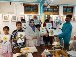 खानम आर्ट गैलरी में आज वर्कशॉप का दूसरा दिन जिस में कोलाज पेंटिंग बच्चो ने बड़े उत्सव से सिखा और सुंदर-सुंदर चित्र बनाने सीखने वाले कलाकरों में दिल्ली से आए जसवंत गिल अशोक तिवारी और पटना से आए रामू कुमार ,डॉ जाहेदा खानम आर्ट गैलरी बच्चो में मुनीज़ा सईद ,मोहम्मद तंज़ील ,मुहम्मद नबील ,मोहम्मद रक़ीब, अदीना फ़ातिमा , निदा अंसारी ने भाग लिया गैलरी में दो पुरुष भावनाओं की भाषा दिखाते हैं और दैनिक दृश्य संस्कृति प्रदर्शनी है चल रही है जिस्का उद्घाटन 11 अक्टूबर को हुआ था यहां 15 अक्टूबर तक चलेगा सुबह 11 से रात 8: 00 बजे तक दर्शनों के लिए काला भी दिखाई है और कई प्रकर की कलाओं के लिए वर्कशॉप हो रहे हैं दिल्ली से आए हुए अशोक तिवारी और जसवंत गिल जी की यह प्रदर्शनी लोगों को बहुत पसंद है एक राही है। लोगों का जमावड़ा देखने के लिए आर्ट गैलरी करेली में पुराने थाने के पीछे पहुंच रहा है।