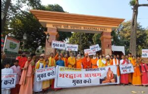 यहां भरद्वाज पार्क पर एकत्रित हुए साधु संतों ने हाथों में तख्तियां लेकर महर्षि भरद्वाज आश्रम को पार्क लिखे जाने का विरोध किया।